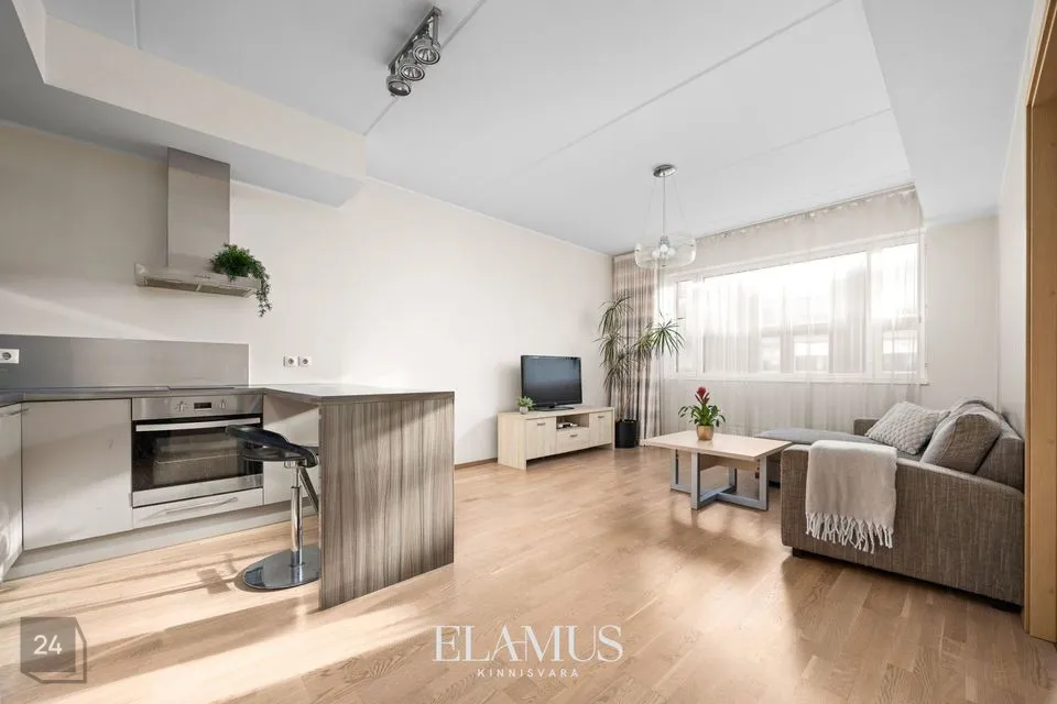 Elutoas ootab heledates toonides lahtikäiv nurgadiivan, diivanilaud, TV ja meeleolu loov vaade sisehoovi.