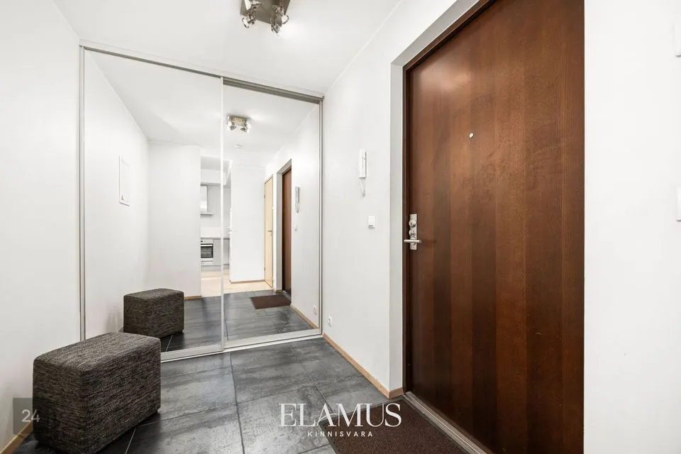 Esik: mahukas maast-laeni peegelliugustega garderoobikapp, plaaditud põrand (lihtne hooldada).