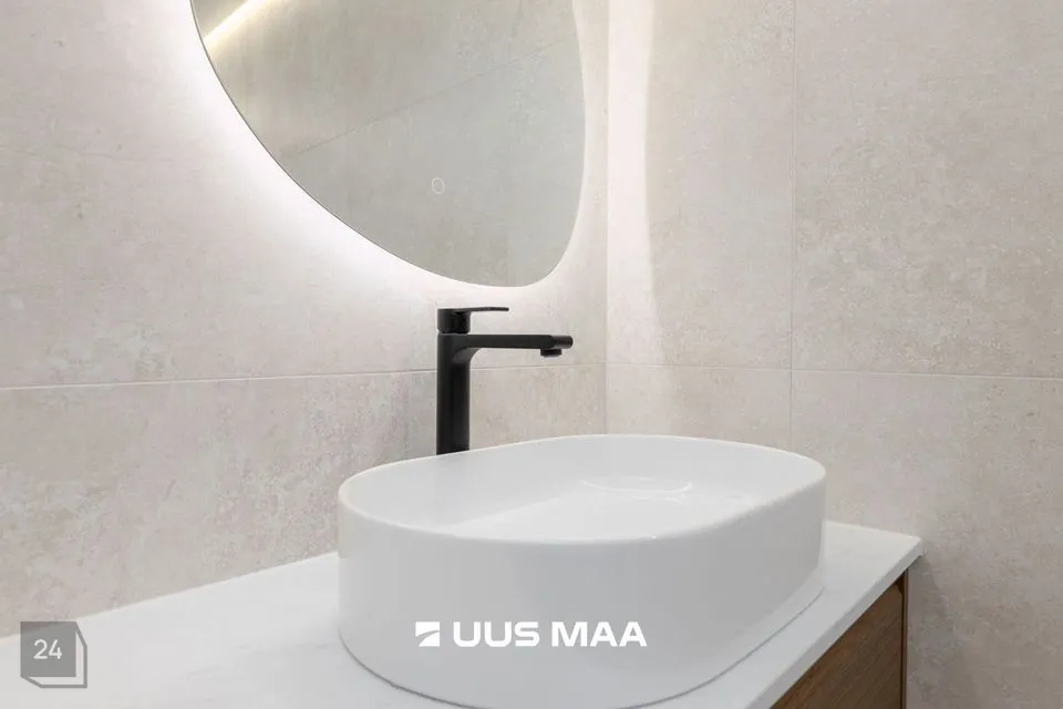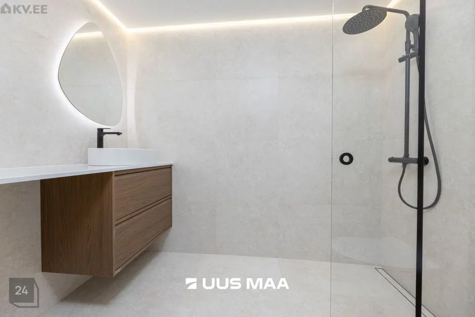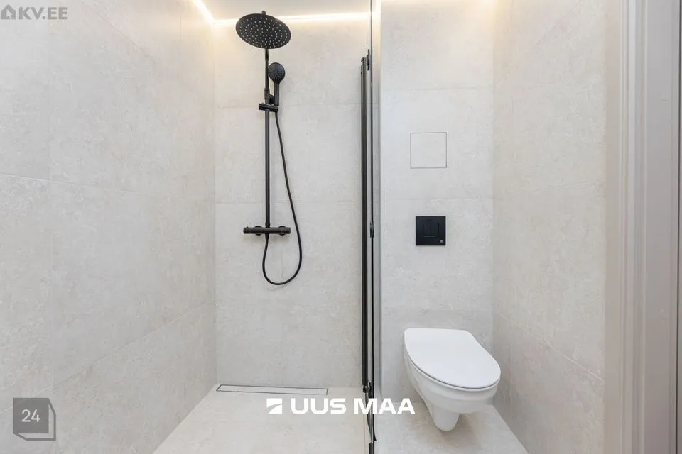 Duširuumis on kivipõrand ja ka reguleeritav põrandasoojendus, uus pesumasin-kuivati, tualett ja dušinurk.