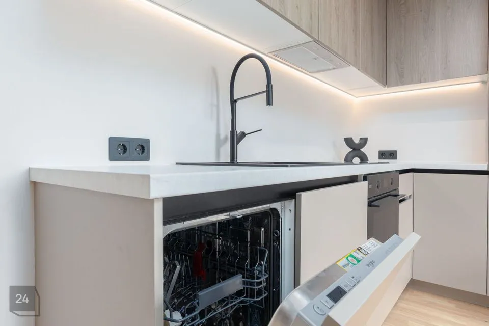Elutuba avatud köögiga on varustatud eritellimusel valmistatud kvaliteetse köögimööbli ja kaasaegse köögitehnikaga. Köögis on palju hoiuruumi ning olemas on pliit, kubu, nõudepesumasin ja integreeritud külmik.