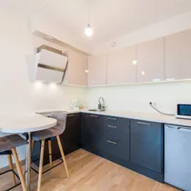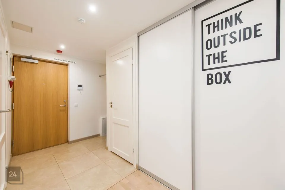 Siseviimistlus on heledates toonides mis võimendavad veelgi avarust ja valgusküllasust. Põrandaid katab puitparkett ning vannitoa ja esiku põrand on viimistletud kvaliteetplaatidega. Lisaks on vannitoas ka elektriline põrandasoojendus. Köök on varustatud praktilise mööbli ning mugava integreeritud tehnikaga (pliidiplaat, õhupuhasti, külmik, nõudepesumasin). Korterisse jääb fotodel nähaolev kogu sisustus.