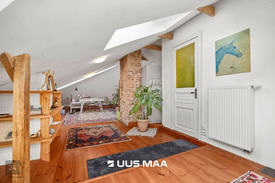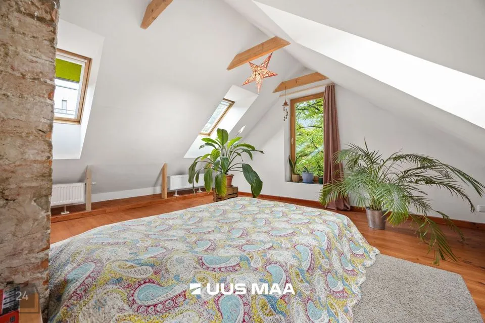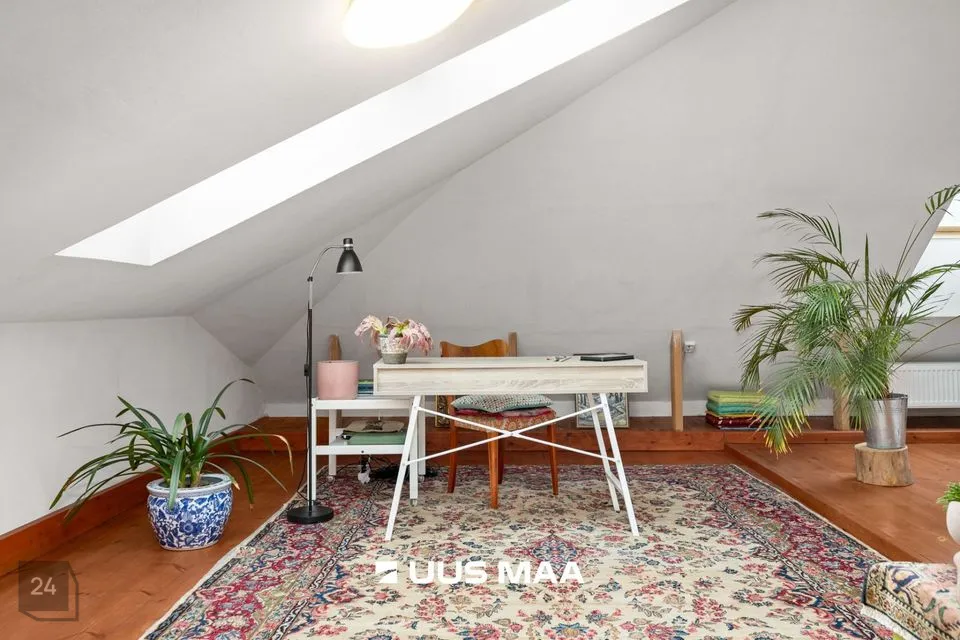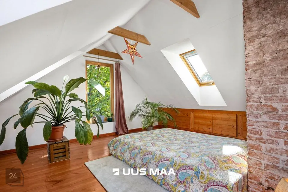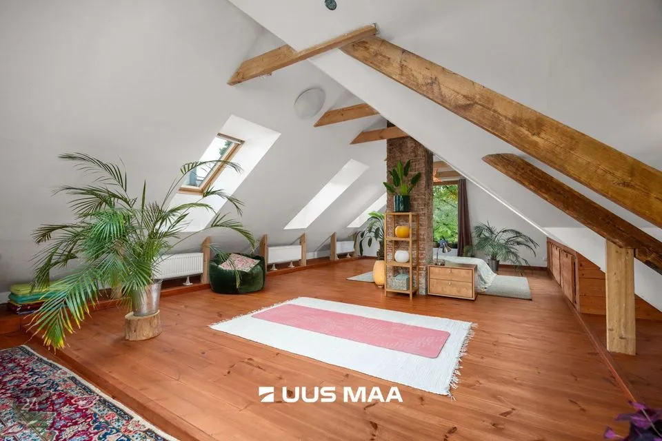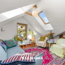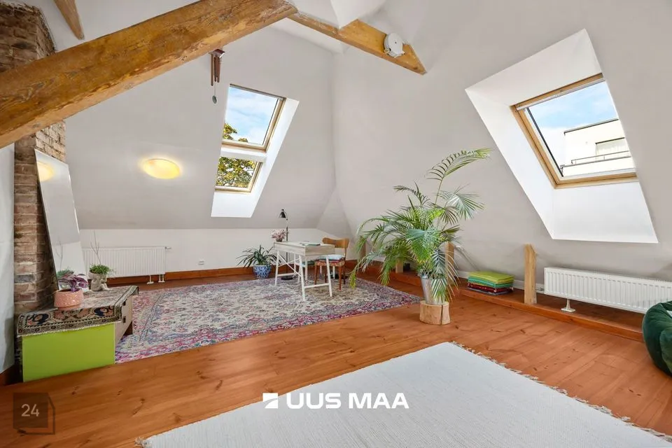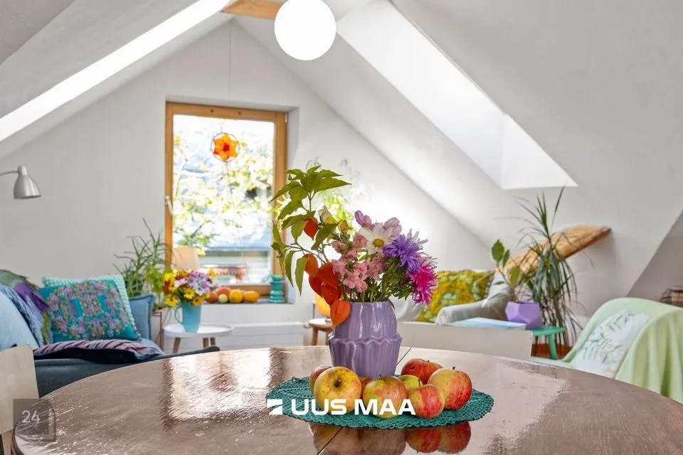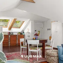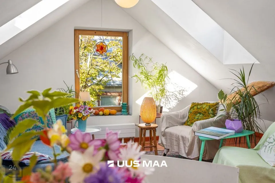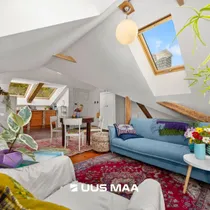 Selles hubases ja avaras katusekorteris on rohkelt aknapinda, mis toob ruumidesse loomuliku valguse pea igast ilmakaarest. Puitlaudisest põrandad ja heledates toonides seinad loovad sooja ja ajatut õhustikku, millele lisavad iseloomu maitsekad värviküllased sisustuselemendid.