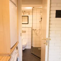 Köögist veel otse edasi minnes on võimalus astuda vannituppa, mis on kokku ehitatud tualettruumiga. Soovi korral on võimalik vannitoas kasutada elektrilist põrandakütet.