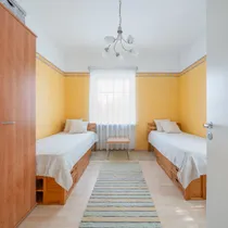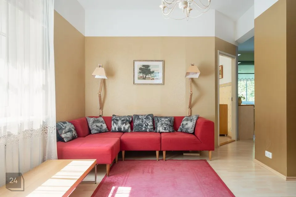 The apartment includes a washing machine, refrigerator, oven and stove, television. The hallway has a spacious wardrobe and the bedrooms have clothing cabinets. One bedroom has a wide bed and the other two separate beds. There is one parking spot under the apartment windows and another car can be parked on Lõime Street.