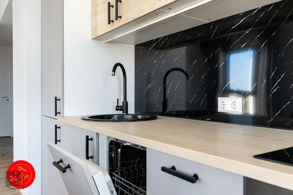 Köögis on kvaliteetne köögimööbel ja -tehnika: induktsioonpliit, ahi, kubu, külmkapp koos sügavkülmikuga ja nõudepesumasin.