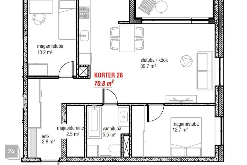 Korteri elamispind on 70,8 m², millele lisandub rõdu (5,2 m²) ja panipaik (2,5 m²).
