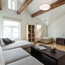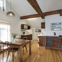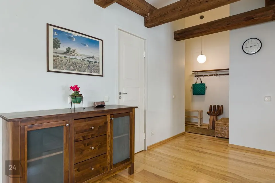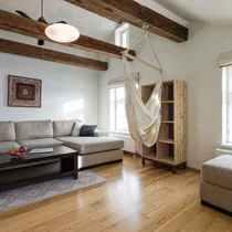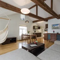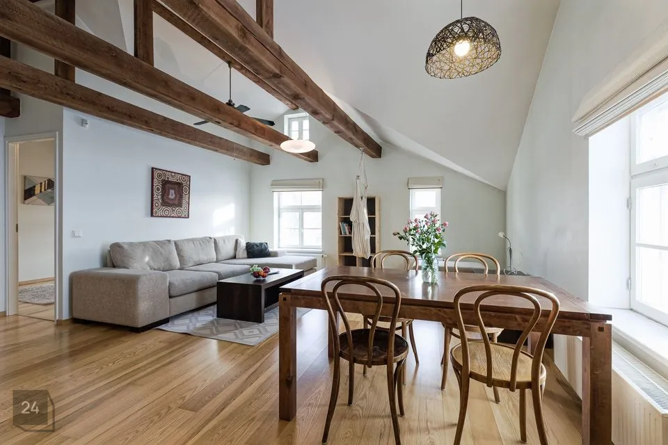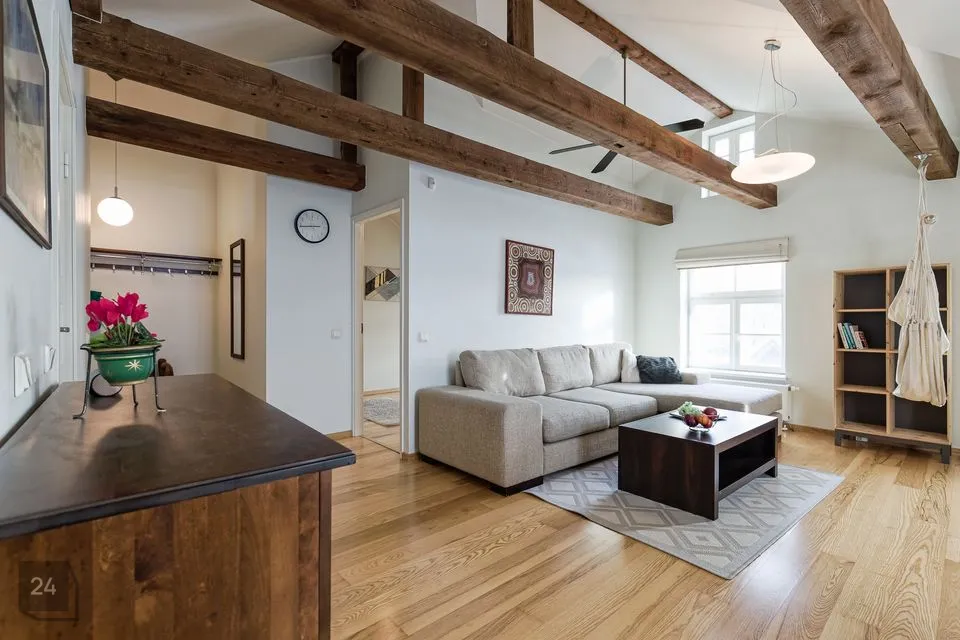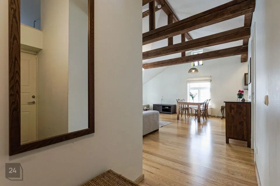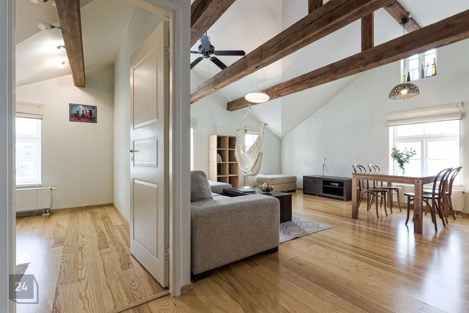 Elutoas kõrged laed, interjööri aktsendiks on vertikaalsed ja horisontaalsed laetalad, põrandaid katab parkett.