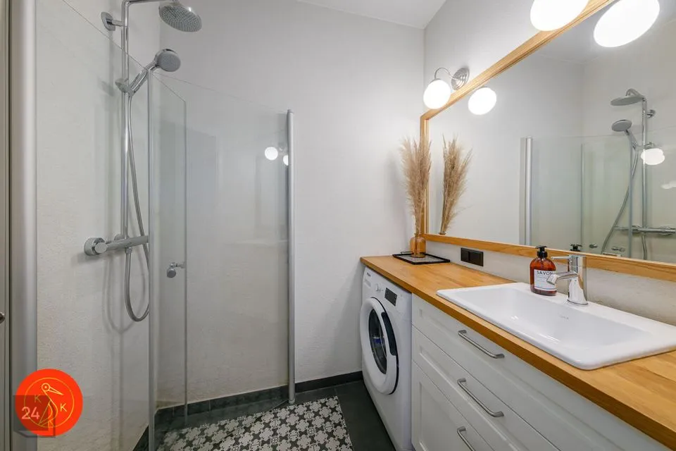 Vannitoas on klaasseinaga dušinurk, mahukas valamukapp, peegelkapp ning pesumasin.