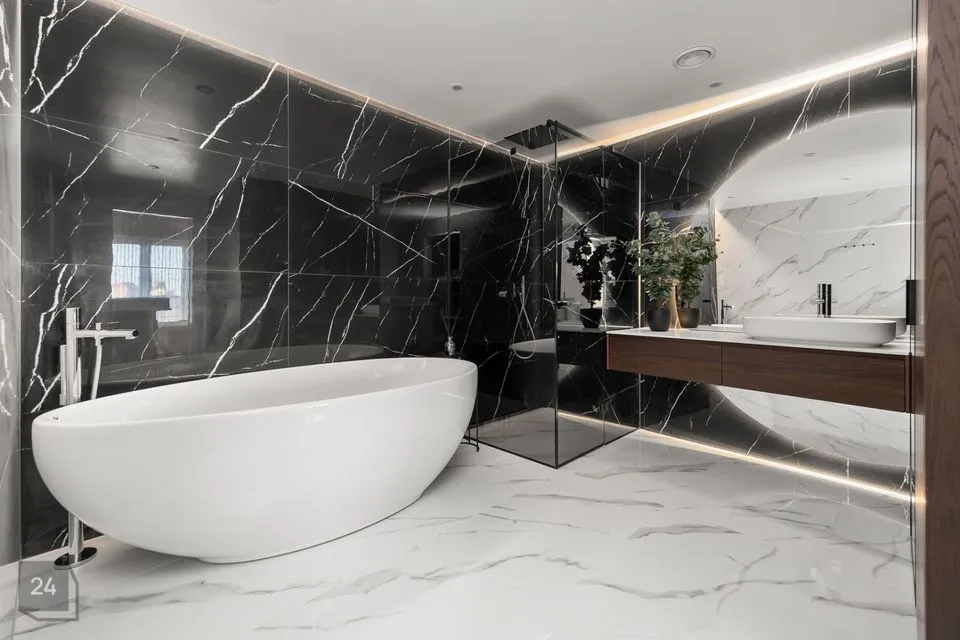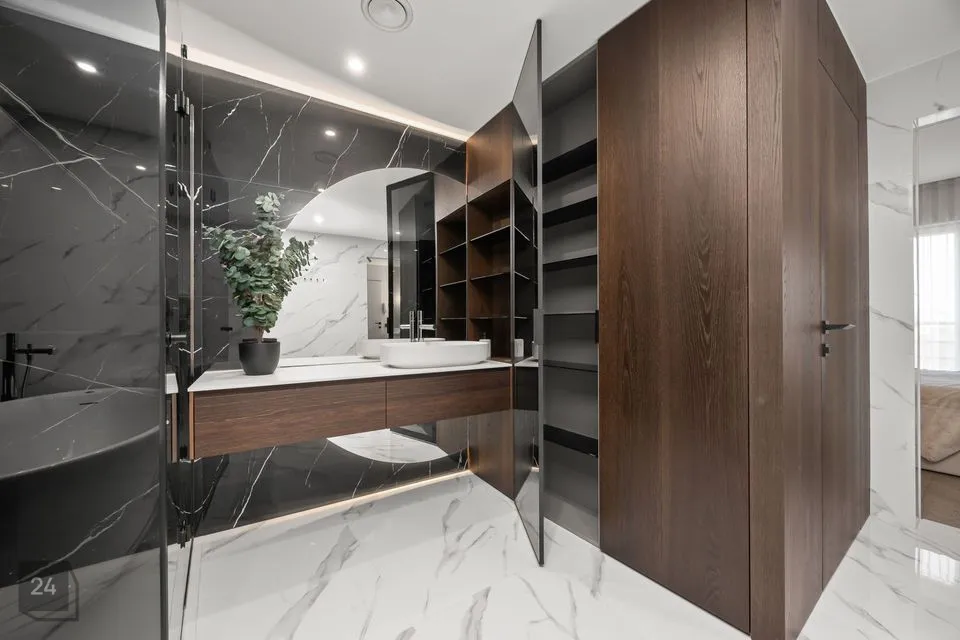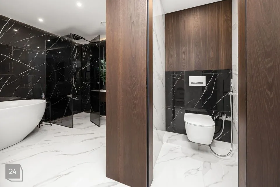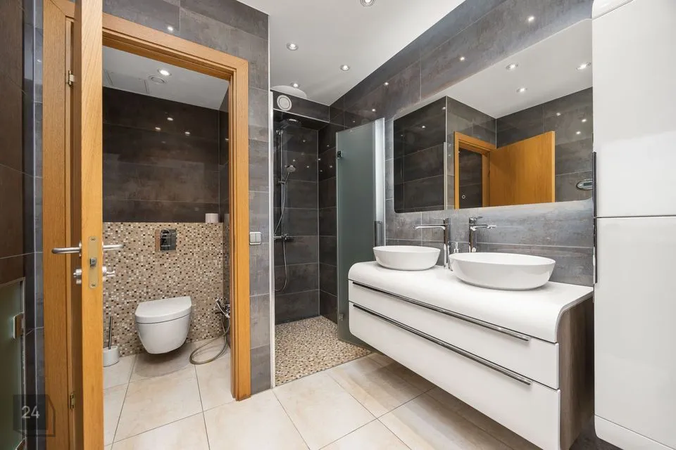 Ruumikas vannituba asub alumisel korrusel, masterbedroomi kõrval. Seal on vann, dušš, tualett.