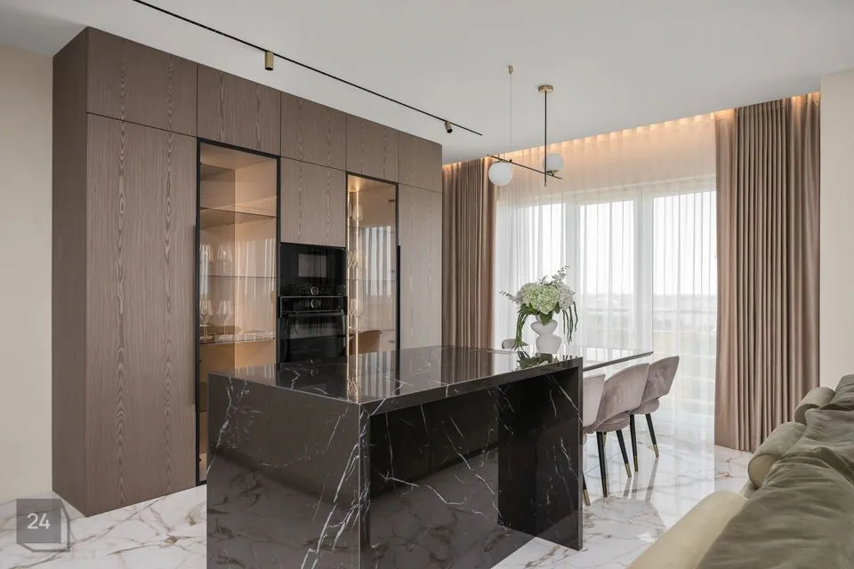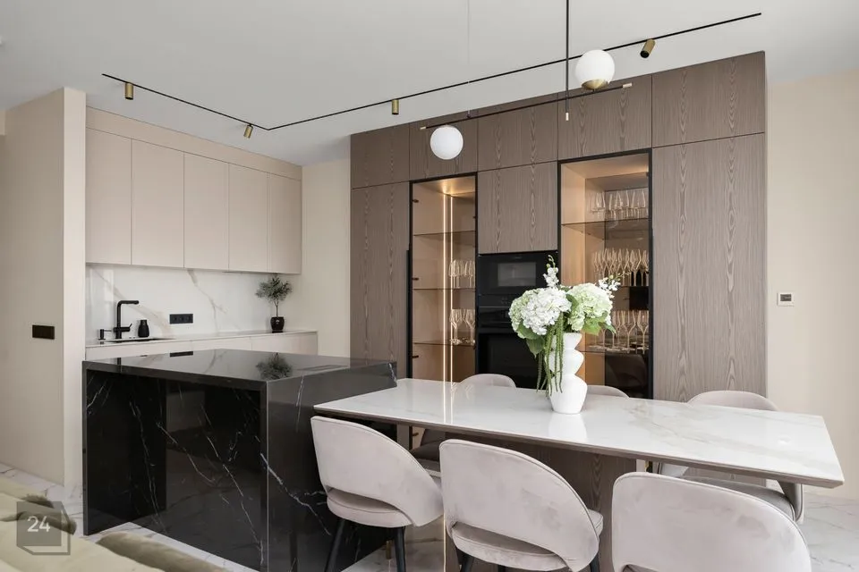 Köögis on integreeritud tehnika, piisavalt kappe, köögi saar, kus koos perega süüa teha ja koosviibimisi pidada. Köögis 2 külmkappi ja veinikülmik.