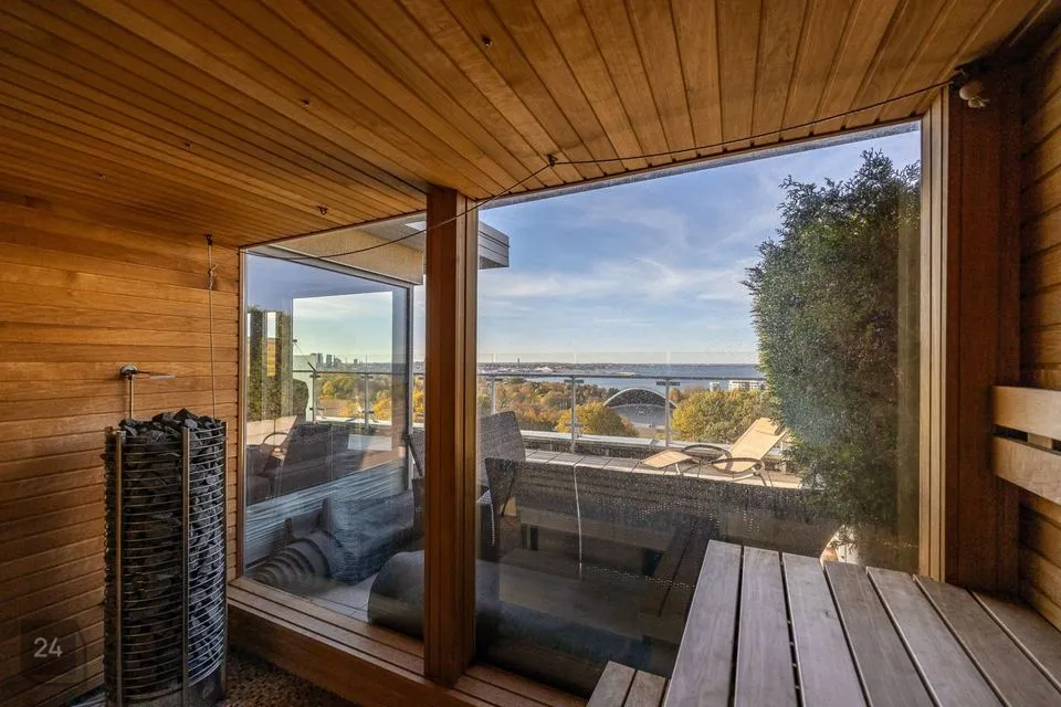 Ülemine korrus (9.k): avatud elutuba (kus on diivaniga istumisnurk). Teine magamistuba koos garderoobiruumiga. Sauna- ja duširuumid, terrassid.