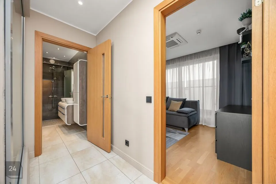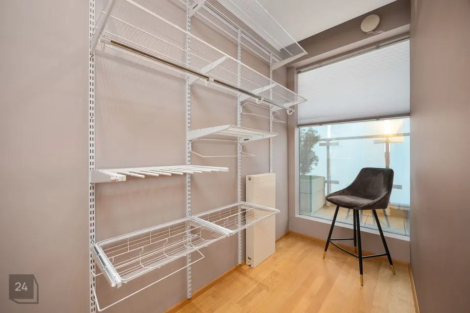 Korteri esikus on mahukas garderoob ja majapidamisruum, kus asuvad pesumasin ja kuivati.