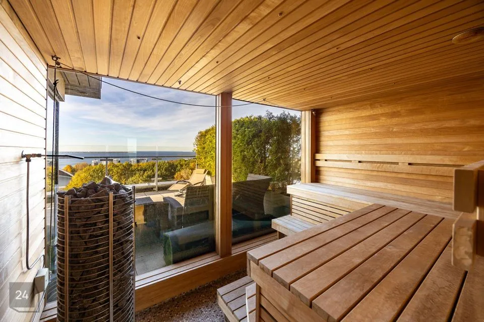Suveks on olemas terrassimööbel. Saunast saab terrassile ja selle eesruumi (TV, diivan), kus mõnus istumine siseruumides, samas vaatega merele.