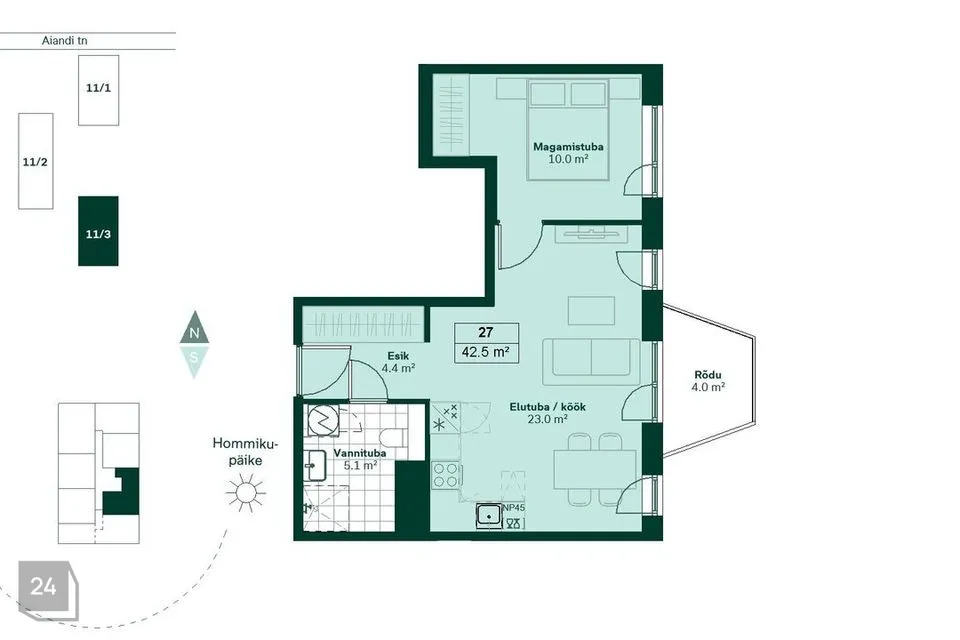 Siit leiad mänguväljakud, viljapuud ja piknikuala; rohkelt tegevusi pakuvad ka välijõusaal ja unikaalne trikirada ekstreemspordi huvilistele. Asudes rahulikus piirkonnas suuremast linnakärast eemal, jalutad siit Mustamäe teele vaid mõned minutid, kust sõidad hõlpsasti kesklinna.