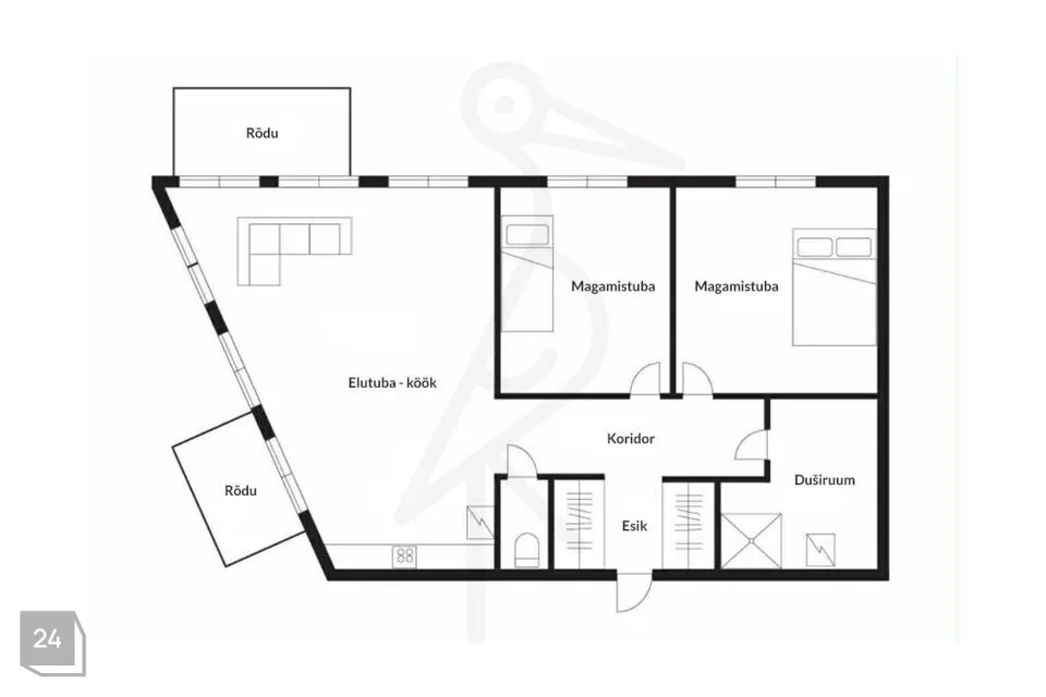 74,6 m² suuruse korteri koosseisu kuulub: panoraamvaatega elutuba koos avatud köögiga , 2 magamistuba, vannituba dušinurga ja WC-ga, eraldiseisev WC ja esik.