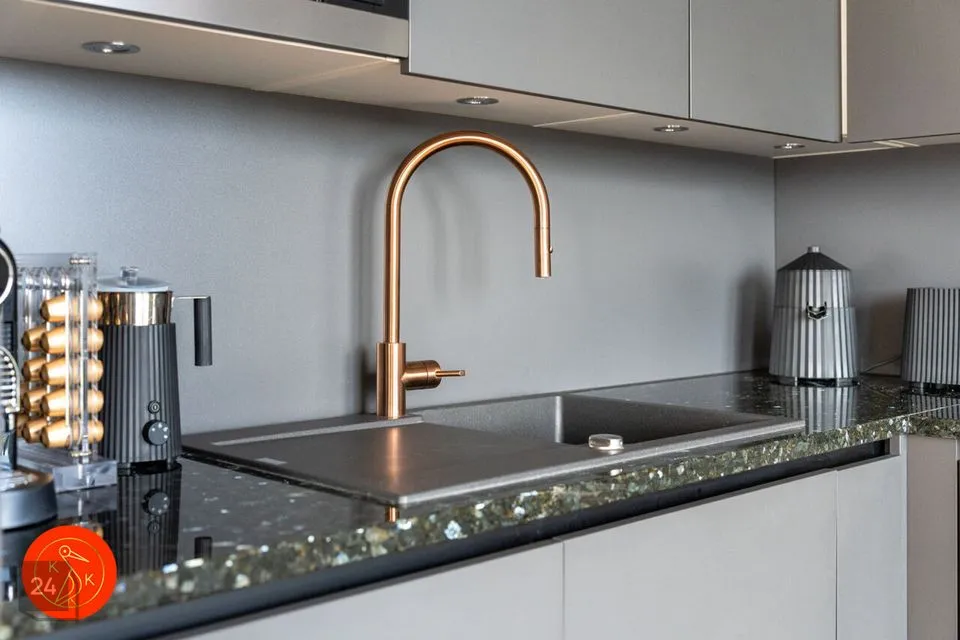 Kvaliteetsesse ja funktsionaalsesse köögimööblisse on integreeritud kõrge kvaliteedi, suurepärase ja ajatu disainiga kodumasinad: elektripliit ja praeahi, õhupuhasti, nõudepesumasin, mikrolanineahi ja külmkapp koos sügavkülmikuga.