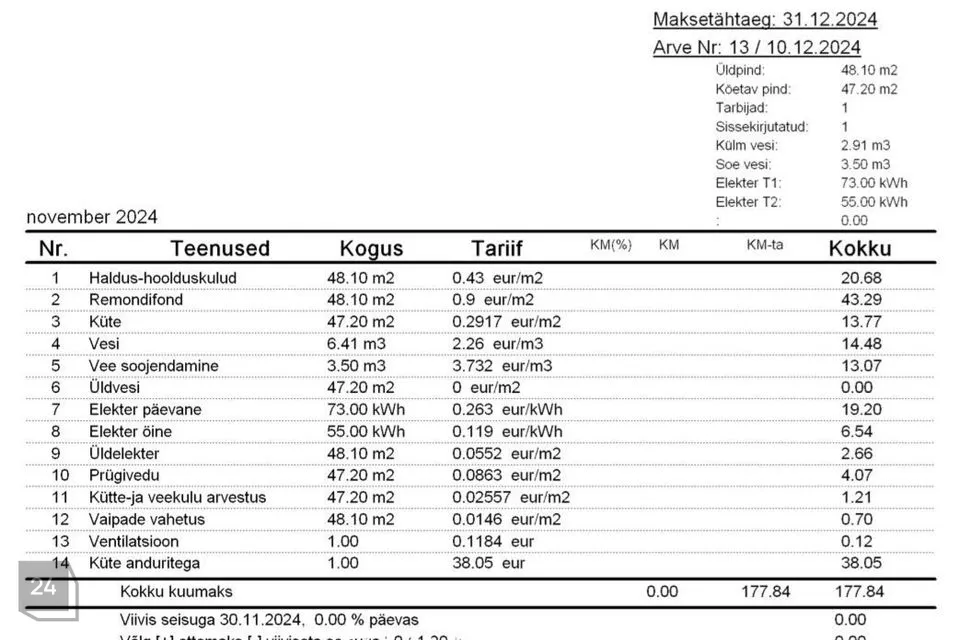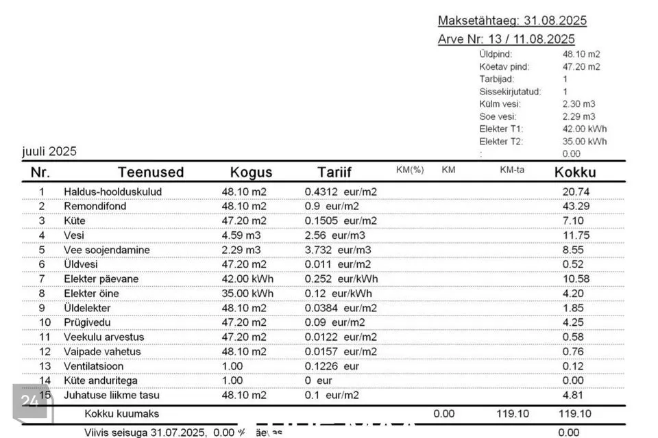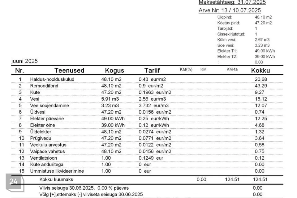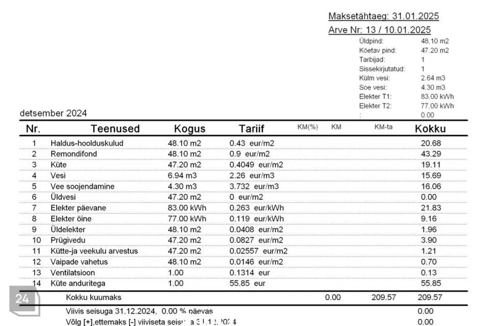 Suvised kommunaalarved on olnud ca 120 eurot ning talvised kuni 210 eurot.