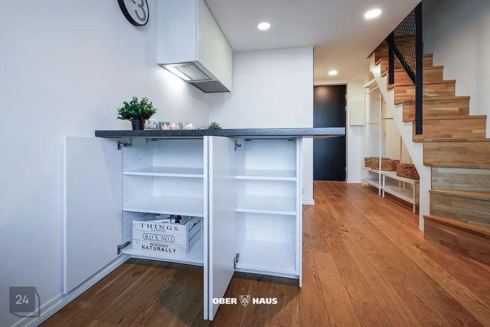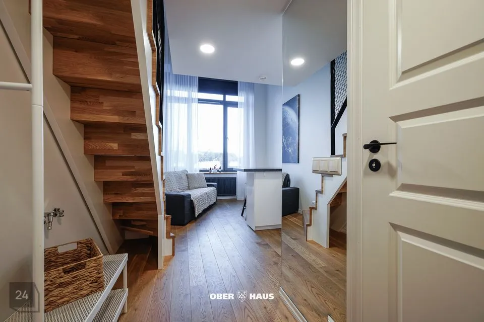 Korteri alumisel korrusel asuvad avatud köögiga elutuba, kõrge laega elamisala, vannituba ja esik.