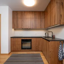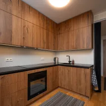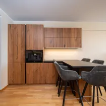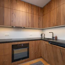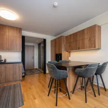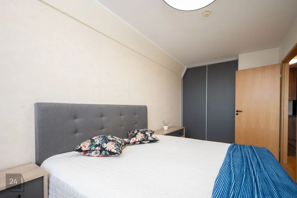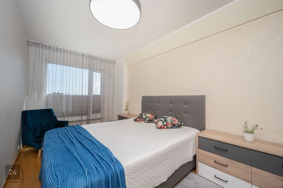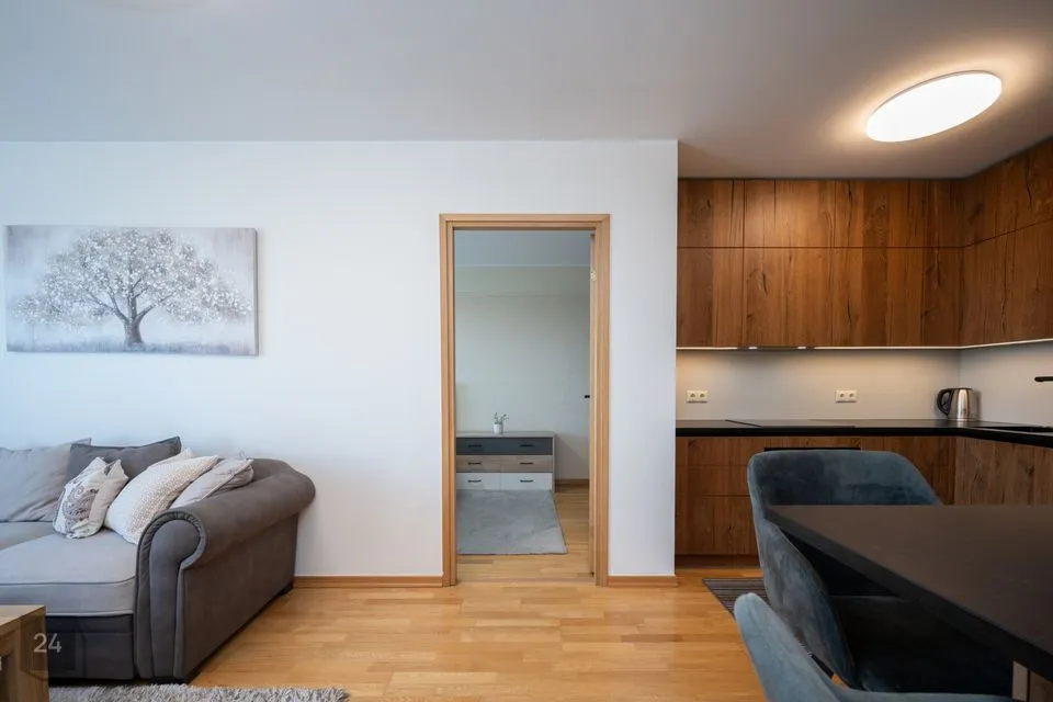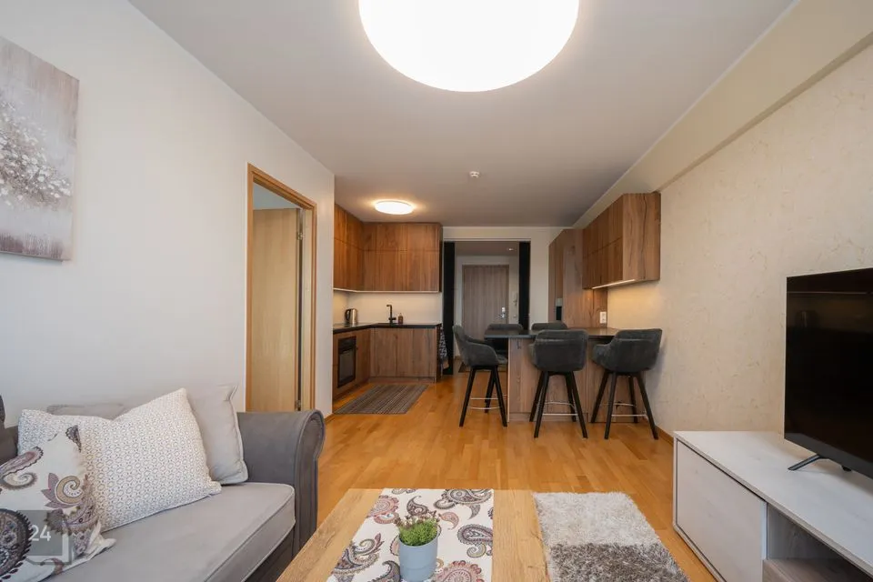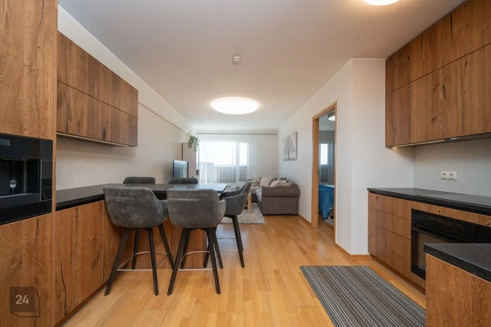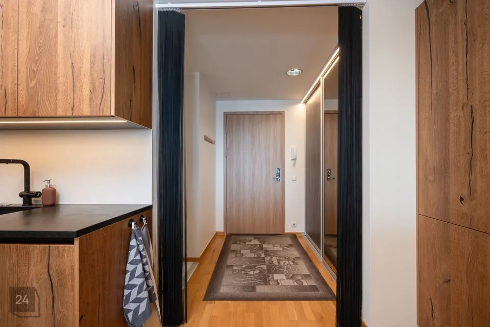 Korteris on ruumikas esik koos maast laeni sisseehitatud garderoobikapiga. Esikust paremale jääb sauna ja dušinurgaga wc-vannituba, kus on olemas ka pesumasin-kuivati. Esikust otse asub avar köök-elutuba. Köögis on olemas kõik vajalik: integreeritud külmkapp, kohvimasin, pliit, ahi, nõudepesumasin ja õhupuhasti. Köögikapid on kõrgele ulatuvad, mistõttu mahutavad väga palju. Elutoas on lahtikäiv diivan, mitmed kapid ning televiisor, mis jääb samuti korterisse. Paremat kätt jääb magamistuba, kus on lai voodi ning ruumikas garderoobikapp.