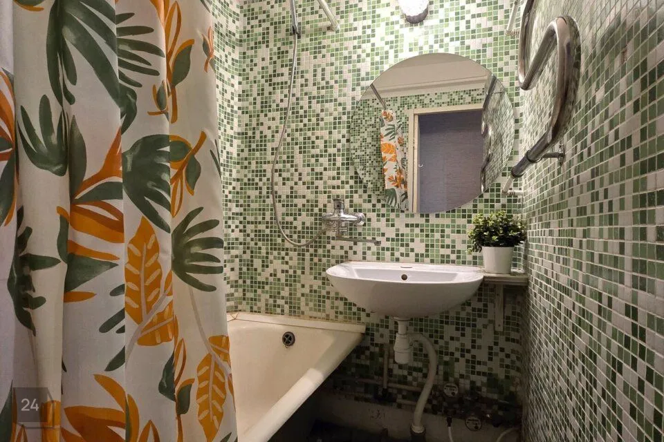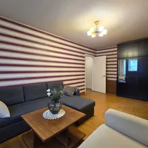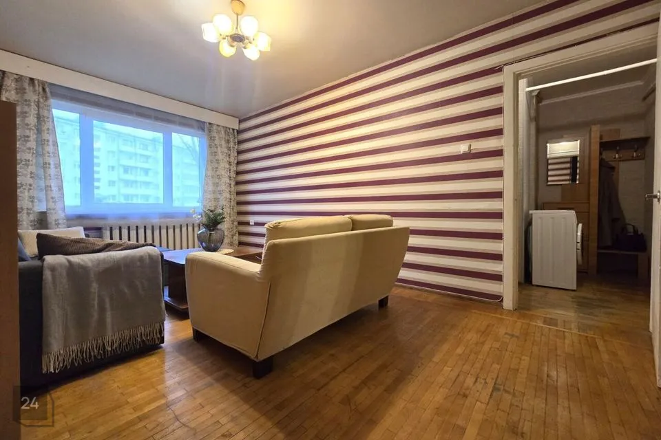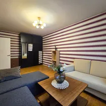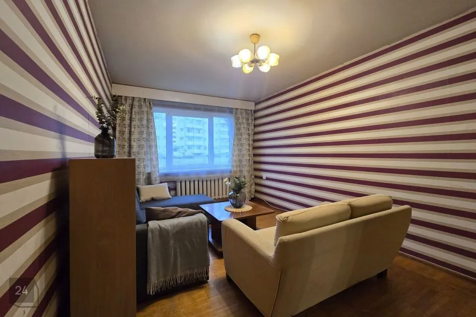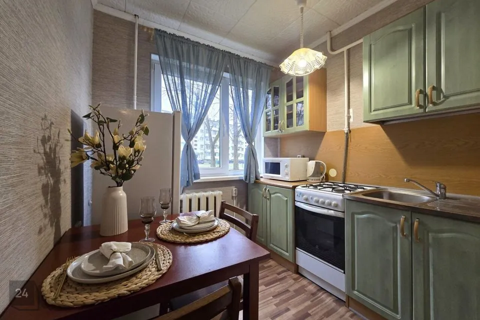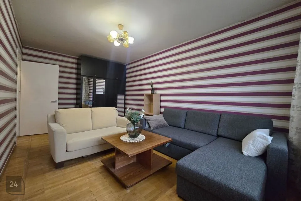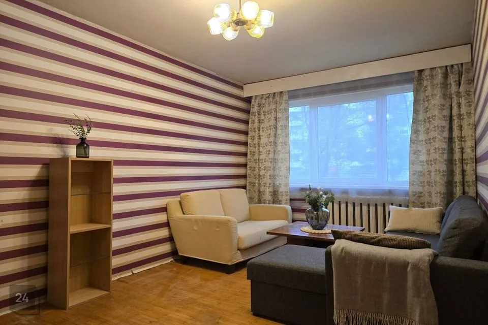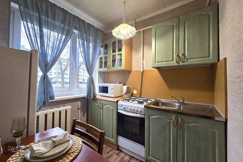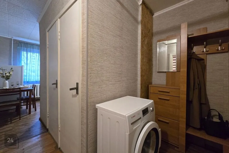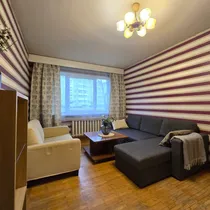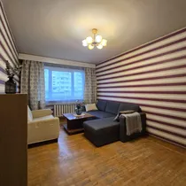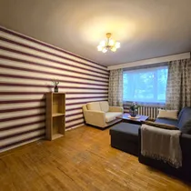 APARTMENT AND LAYOUT Cozy 1-room apartment for rent, with windows overlooking a quiet and green courtyard. The apartment is warm and bright, located in the center of the building on the first floor. The apartment area is 29.9 m². The kitchen has cabinets for storing dishes, a table and two chairs, with appliances including a gas stove, refrigerator, microwave, and electric kettle. The hallway has a small cabinet and a washing machine. The toilet and bathroom are separate. The living room has a wardrobe, two sofas, one of which is a sofa bed, and a coffee table.