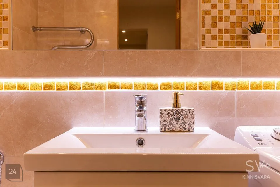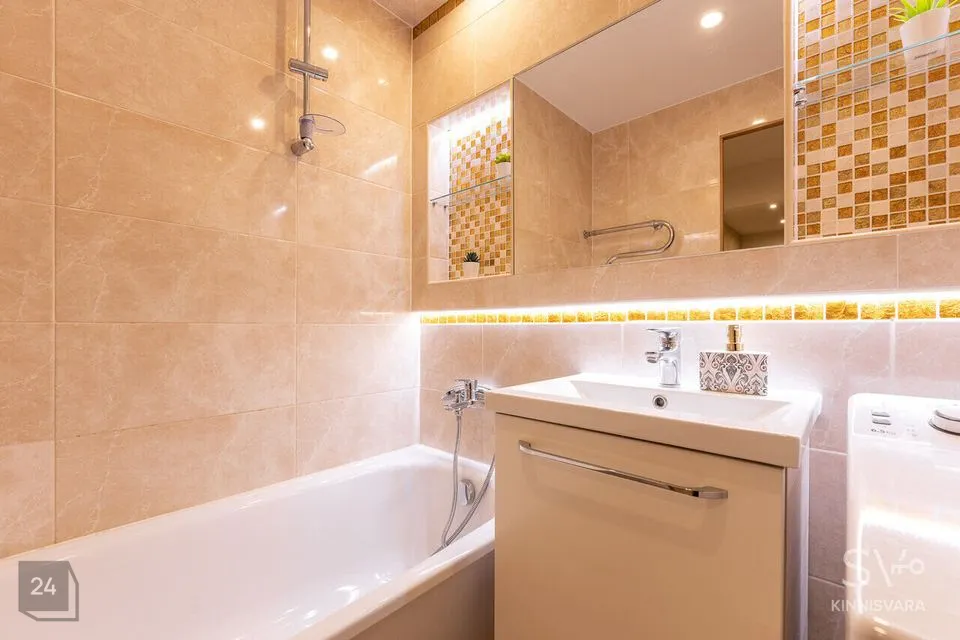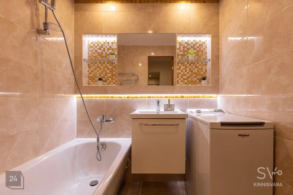 WC ja vannituba paiknevad eraldi, paigaldatud kvaliteetne keraamiline plaat. On olemas pesumasin.