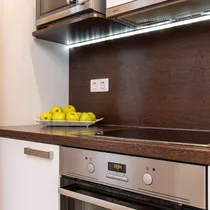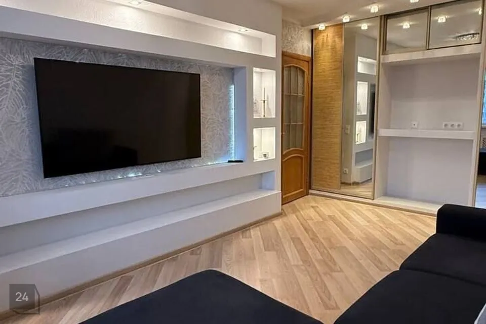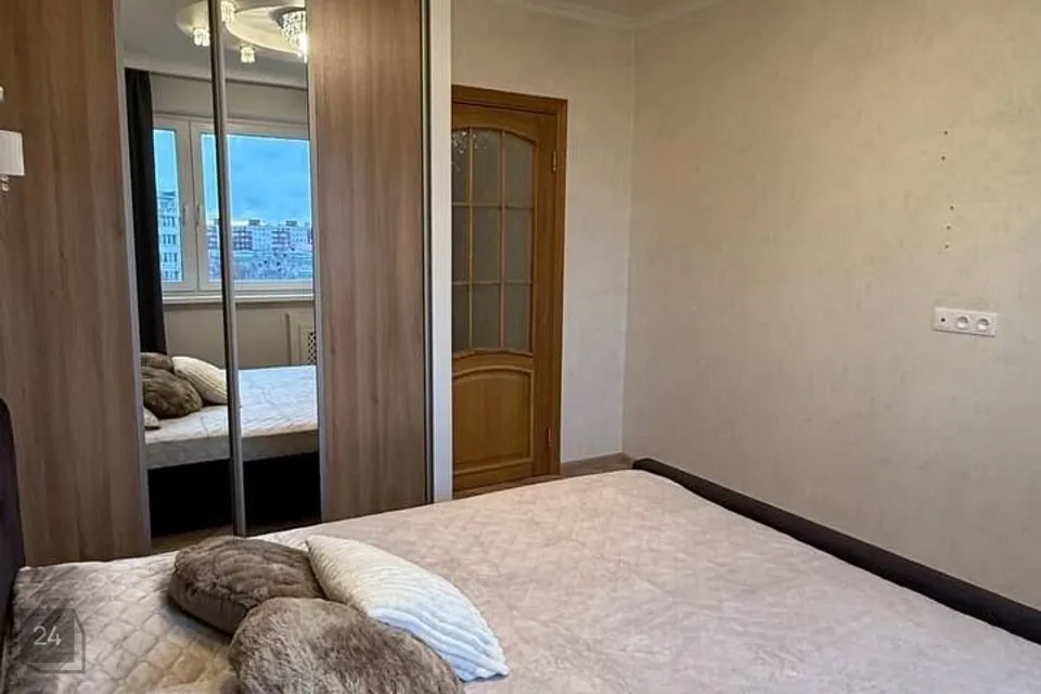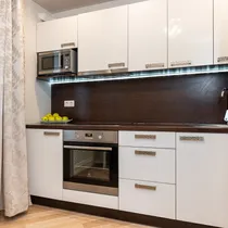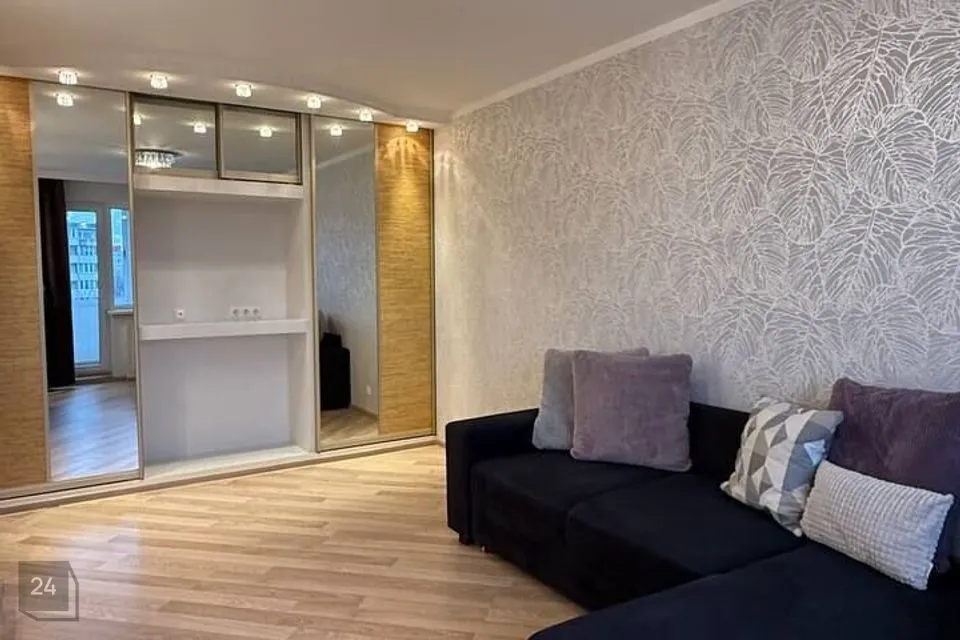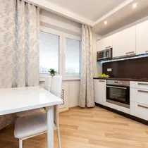 В квартире имеется все необходимое для жизни. Кухня с встроенной техникой (эл.плита, духовка, холодильник, вытяжка). Из гостиной выход на балкон.