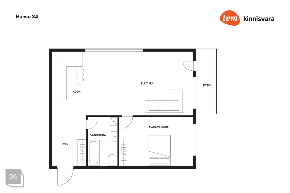 Garderoobiga esikuosa, avatud elutuba ja köök ning eraldi magamistuba.