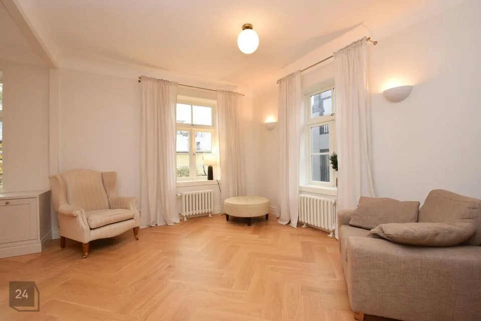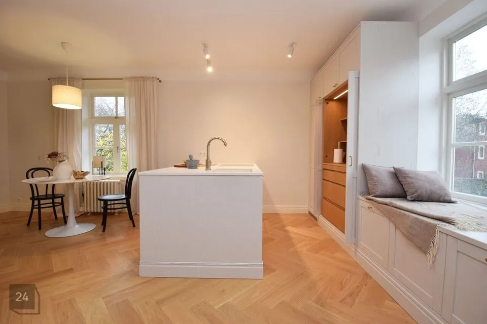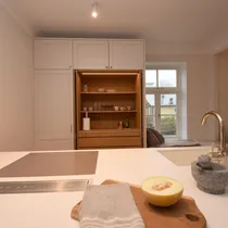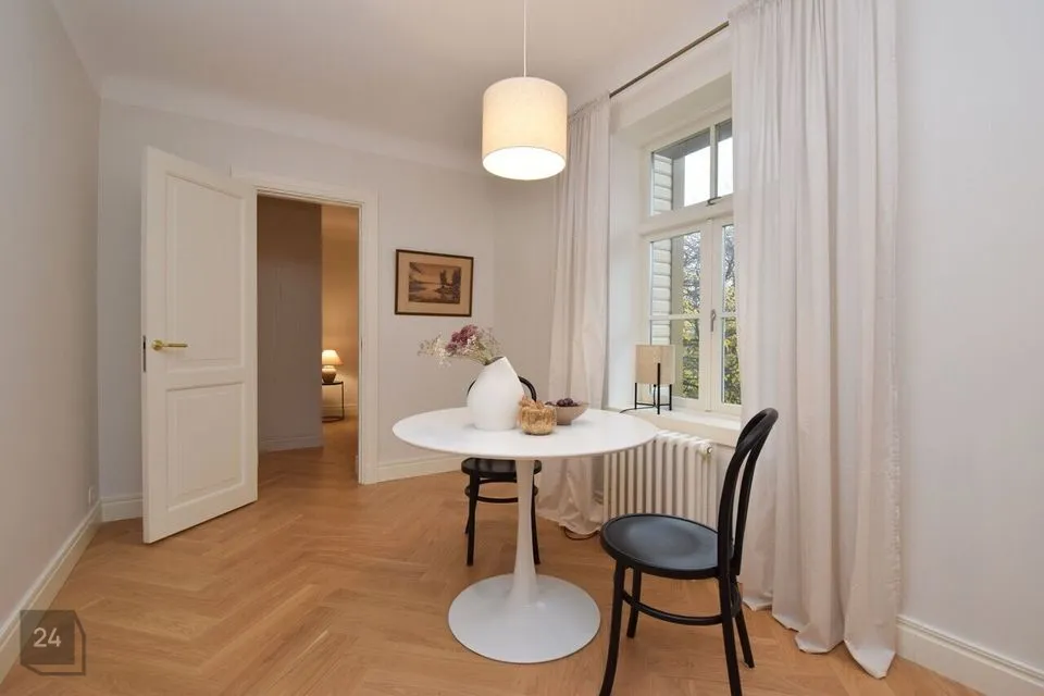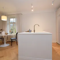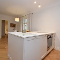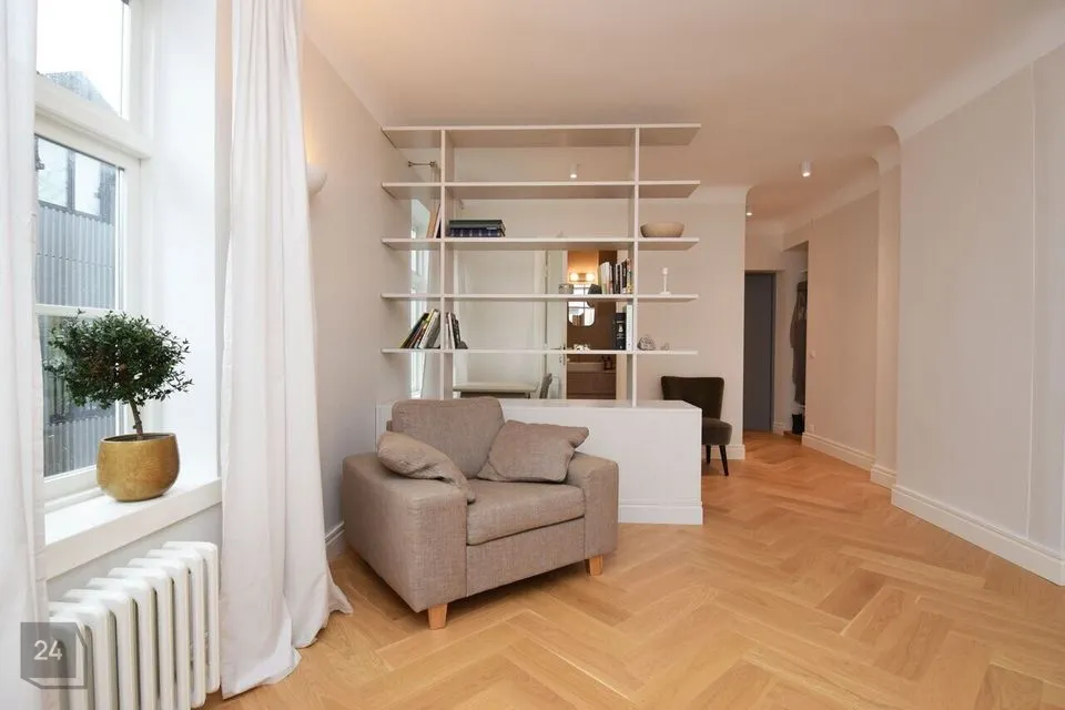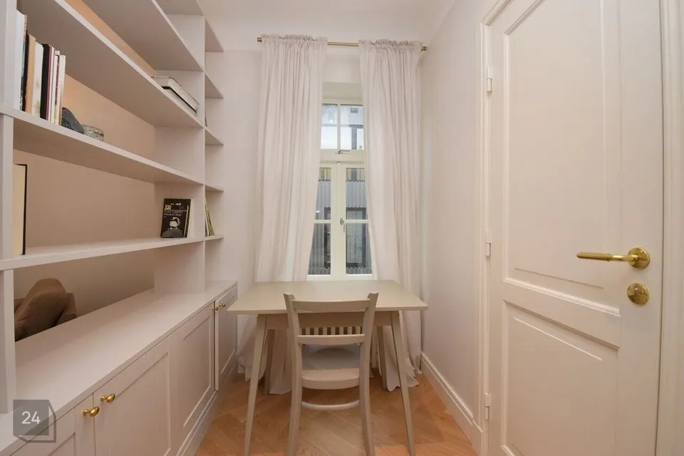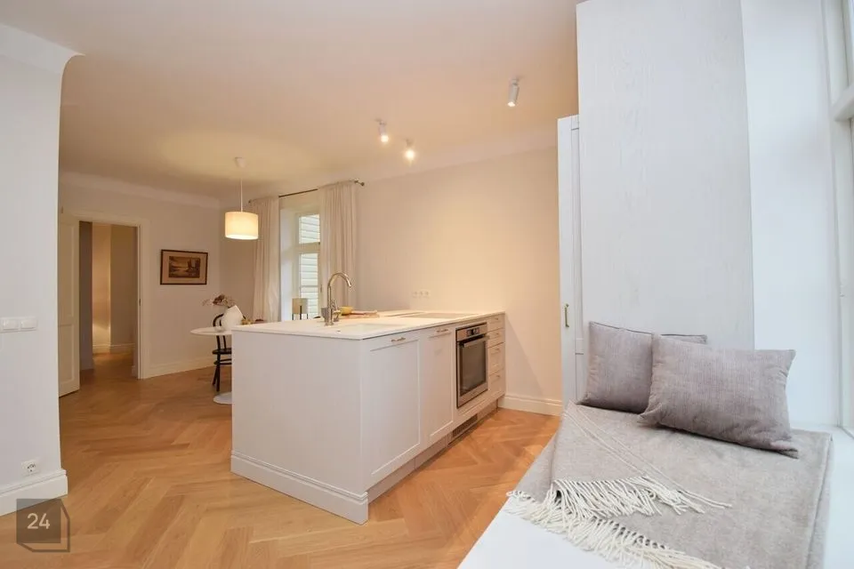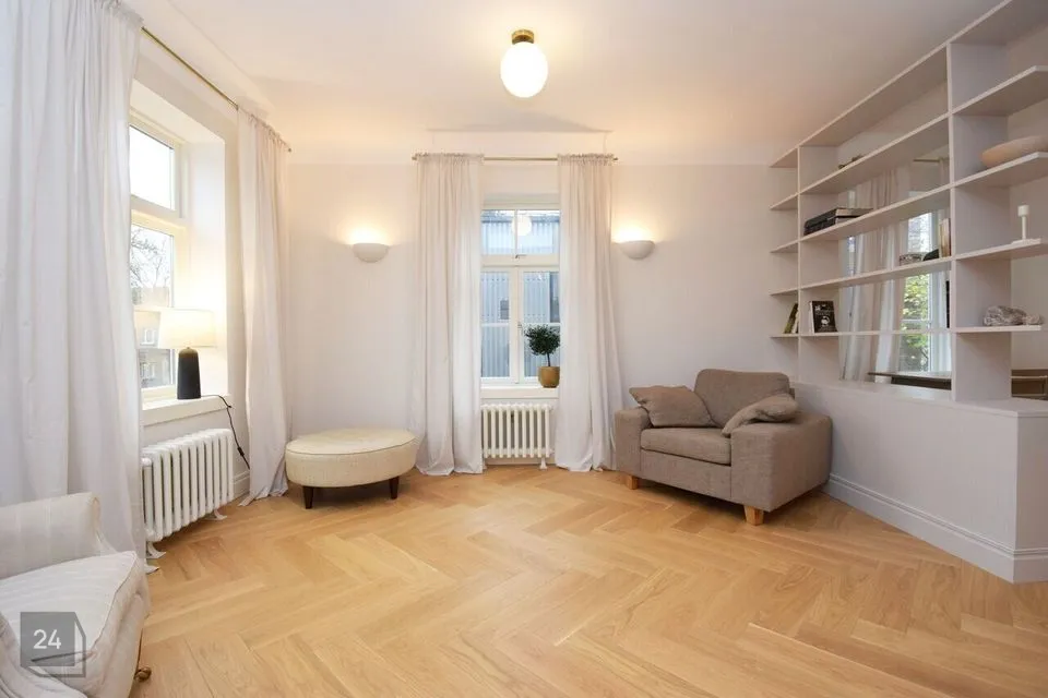 Korteris on kasutatud kvaliteetseid materjale (tammest kalasaba parkett, puidust eritellimusmööbel).