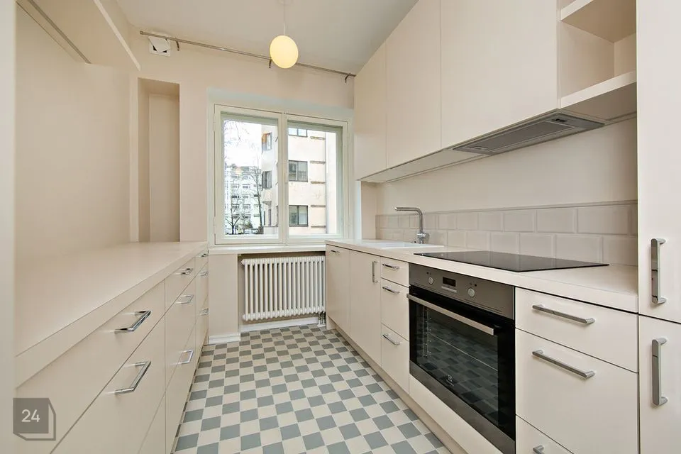 Köök on lahendatud täiesti eraldi ruumina ning on varustatud integreeritud tehnikaga (pliit, ahi, kubu, nõudepesumasin, külmkapp).