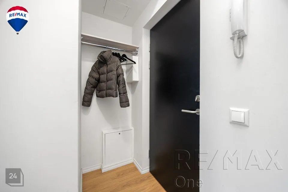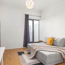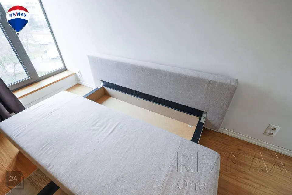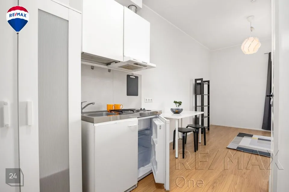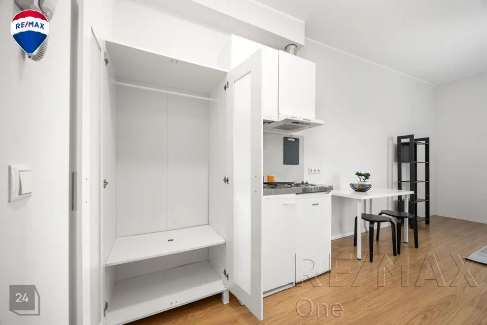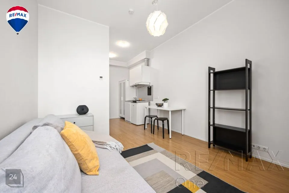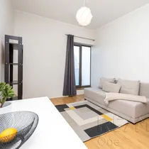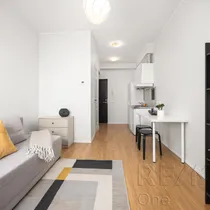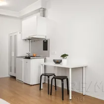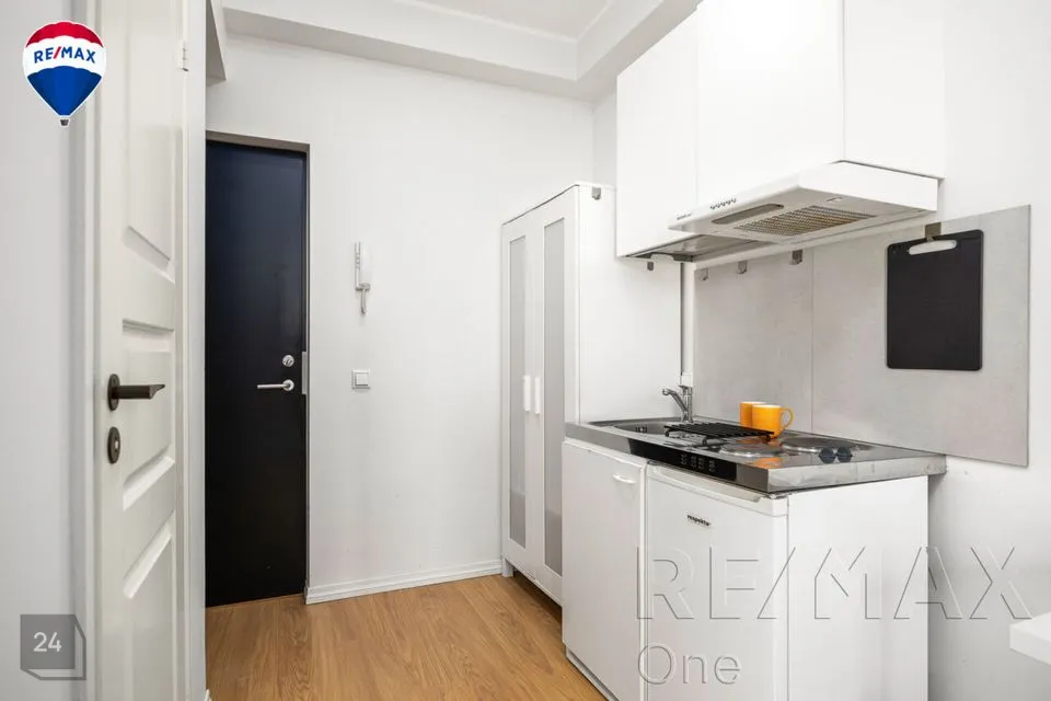 Kõrge akna ja ilusa vaatega nutikasse hubasesse väikekorterisse on mahutatud kõik olulisem - lahtikäiv diivan, riidekapp, kummut, nagi üleriiete jaoks, köögimööbel koos tehnikaga (elektripliit, külmkapp koos väikese sügavkülmikuga), väike diivanilaud ning söögilaud kahe tooliga.