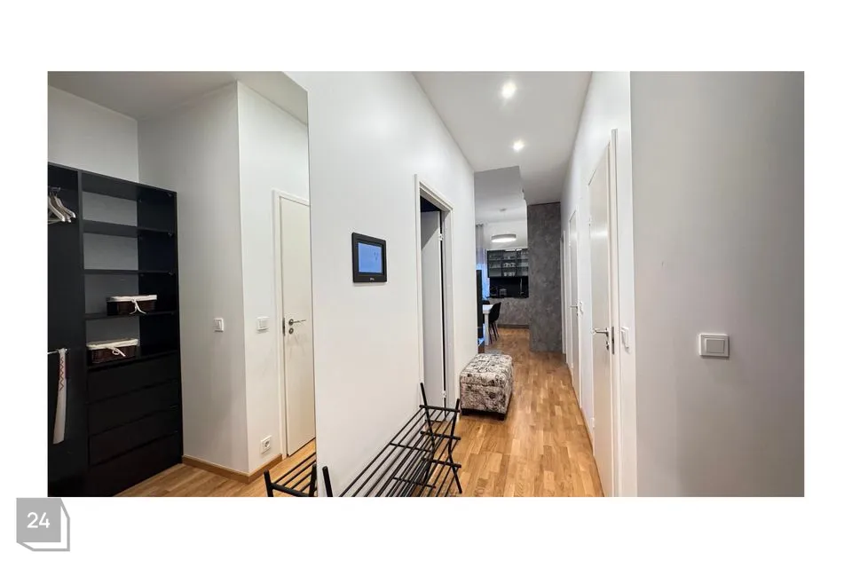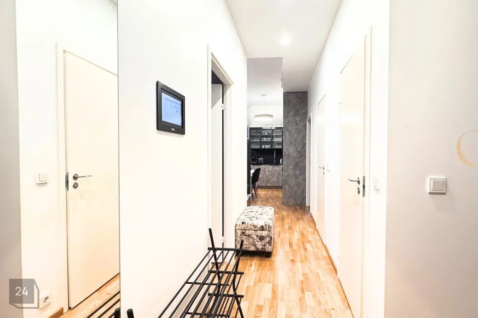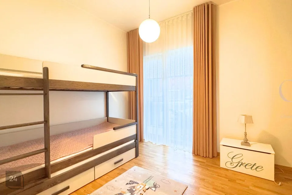 Korteri koosseisus on garderoob, esik, lastetuba, elutuba, magamistuba, terrass, dušširuum ja eraldi tualett. Korteril on väga palju kapipinda, kõrged riidekapid kui ka köögikapid. Korter antakse üürile täielikult sisustatuna. On olemas kogu vajalik mööbel, kodu- ja köögitehnika kaasaarvatud ka väike köögitehnika (kohvimasin, veekeedukann, röster) ja kööginõud (potid, pannid, söögiriistad, nõud, klaasid), televiisor, diivan, köögilaud ja toolid, kahekohaline voodi ja narivoodi, kogu korteri kardinad ja rulood. Vannitoas on olemas eraldiseisvad pesumasin ja kuivati.