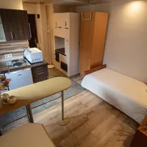 Kööktuba on möbleeritud. Olemas on voodi, riidekapp, peeglilaud, väike öökapp, väiksem baarilaud koos toolidega ning uus miniköök kus on elektripliit ja külmkapp. Lisaks on korteris mikrolaineahi. Akna ees on kardin ja voldikkardin. Lisaks on üürniku kasutuses olevas panipaigas suurem külmkapp ja riidekapp.