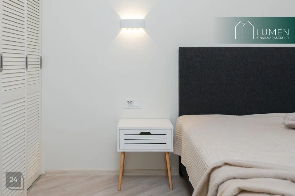 Magamistuba: 160x200 cm voodi, 2 öökappi, liugustega garderoob (sisseehitatud valgusega), riidepuud.