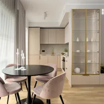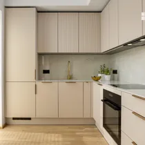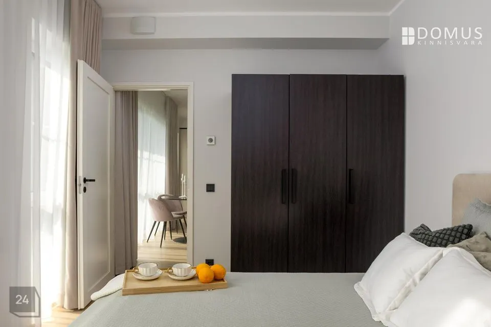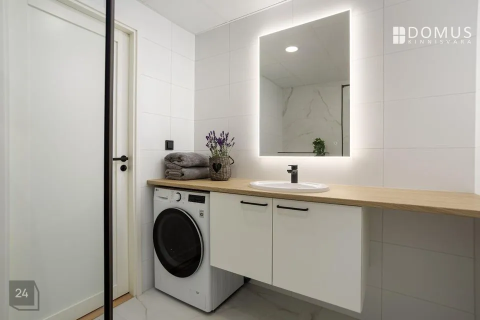 Kvaliteetne köök on sisustatud kõige vajalikuga, tasapind on kivist. Tehnika: nõudepesumasin, pürolüüsiga praeahi, induktsioonpliit, külmik, õhupuhasti.