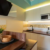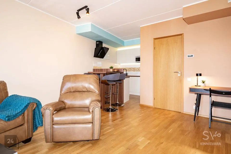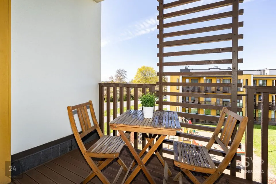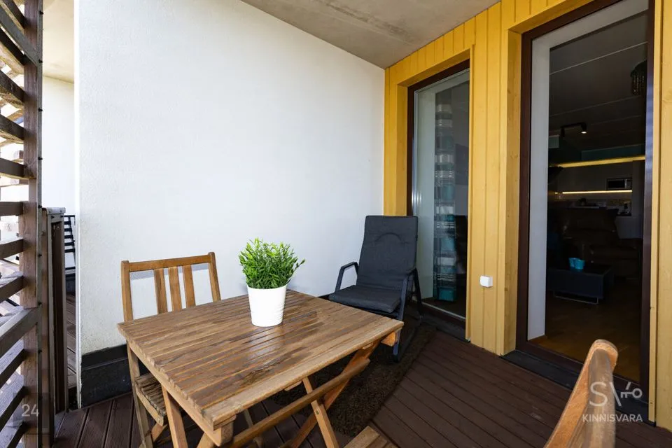 Korteris on avar esik suure sisseehitatud garderoobikapiga, hubane magamistuba koos garderoobinurgaga, duširuum/WC koos ning avatud köögiga elutuba. Elutoast pääseb suurele 7,5 m² terrassile, kus saab nautida hommikukohvi, päevitada või imetleda osalist merevaadet ja õhtupäikest.