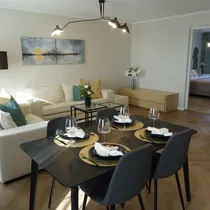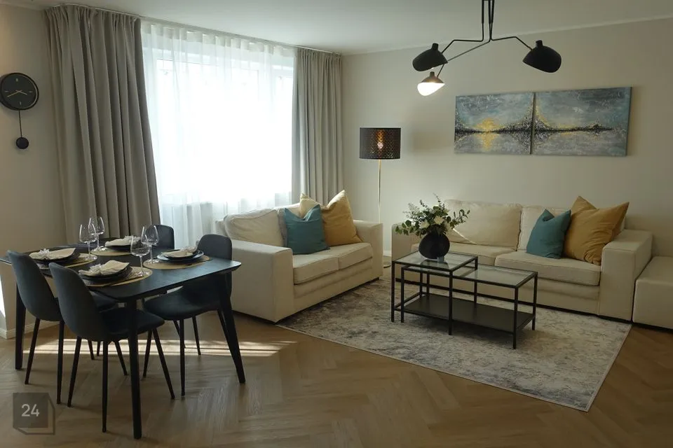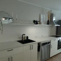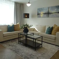 Elutuba-köök: köögimööbel, nõudepesumasin, külmkapp, integreeritud ahi ja pliit, õhupuhasti, pimendavad rulood, plastikaknad, kardinad, rõdu, 2+3 istekohaga diivanid, tumba, TV alus, söögilaud+toolid, diivanilaud, kummut, põrandalamp.