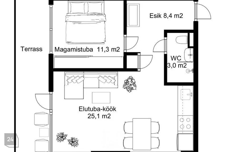 Praktiline ja hea planeering pakub kõike vajalikku mugavaks eluks: avar 25,1 m² köök-elutuba, eraldi paiknev 11,3 m² magamistuba, wc-duširuum 3m² ning 8,4 m² avar esik praktilise sahvriga.