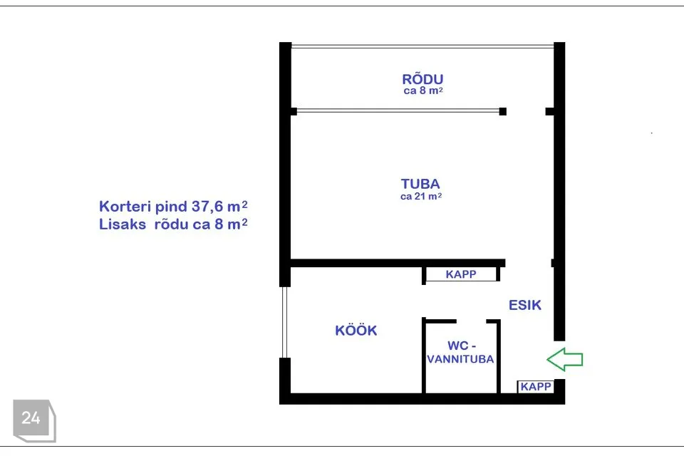 Korteri köetav pind 37,6 m2 + lisaks ca 8 m2 rõdu.