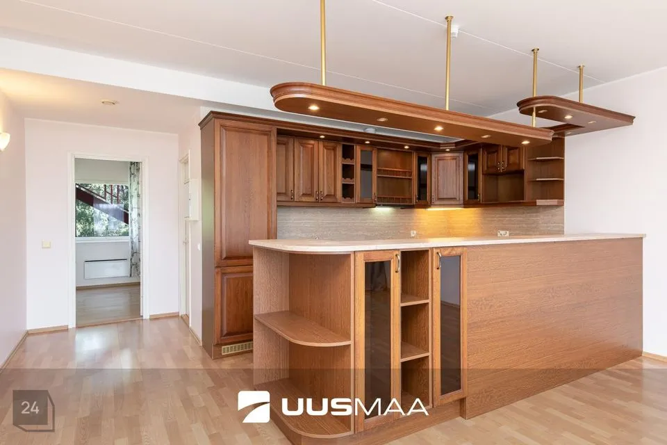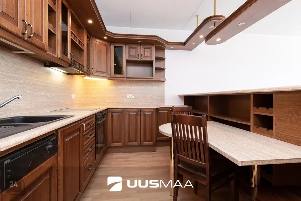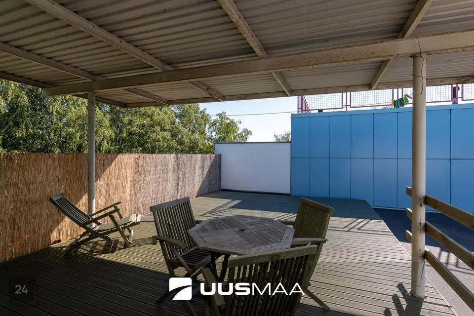 Korteri koosseisu kuuluvad avatud köögiga elutuba, 2 magamistuba, esik, WC ning vannituba ja suur katuseterrass. Täispuidust köögis on integreeritud nõudepesumasin, pliit ahi, kubu ja külmkapp. Avarust lisavad kõrged laed ja suured panoraamaknad elutoas. Vannitoa plaaditud põrandate all on elektriline põrandaküte.
