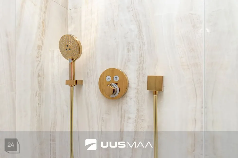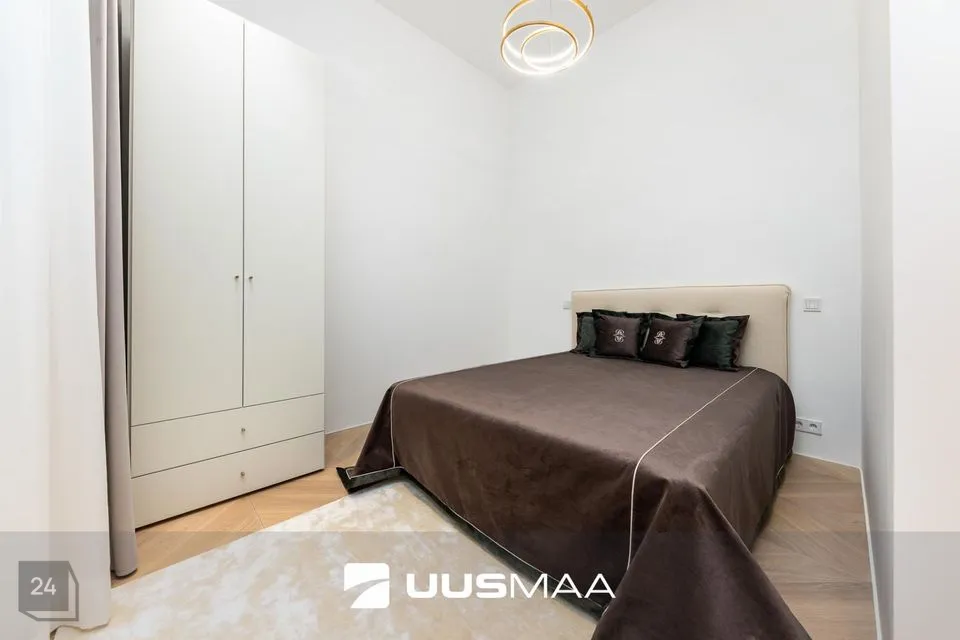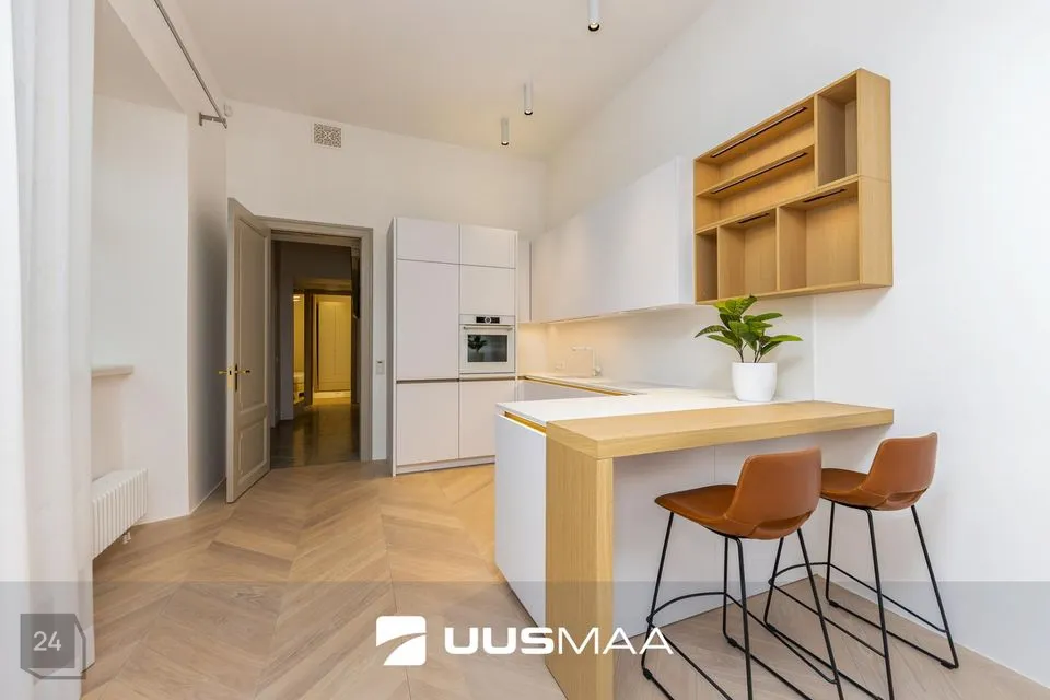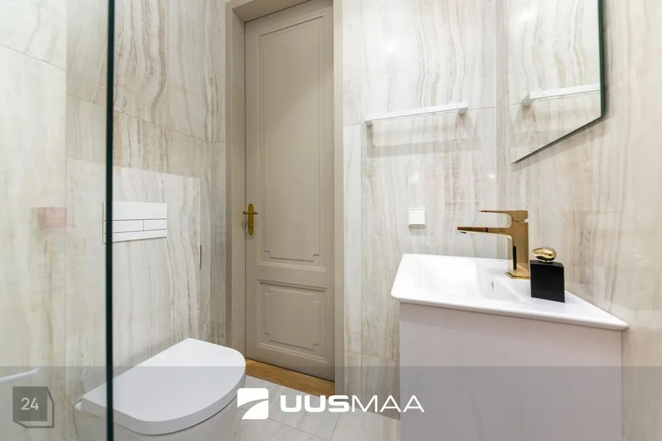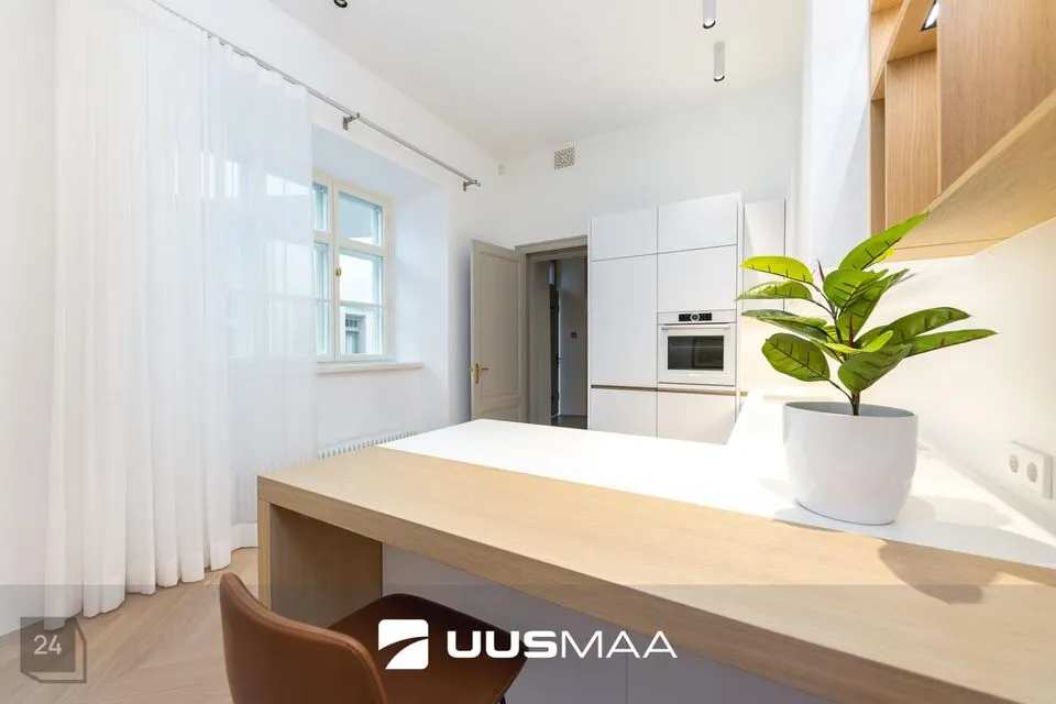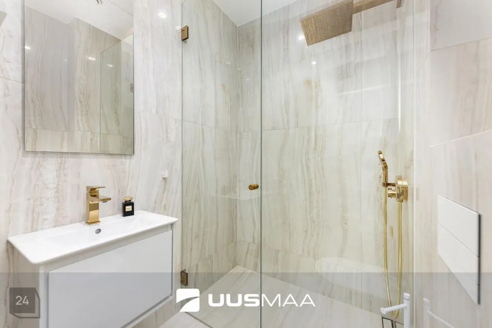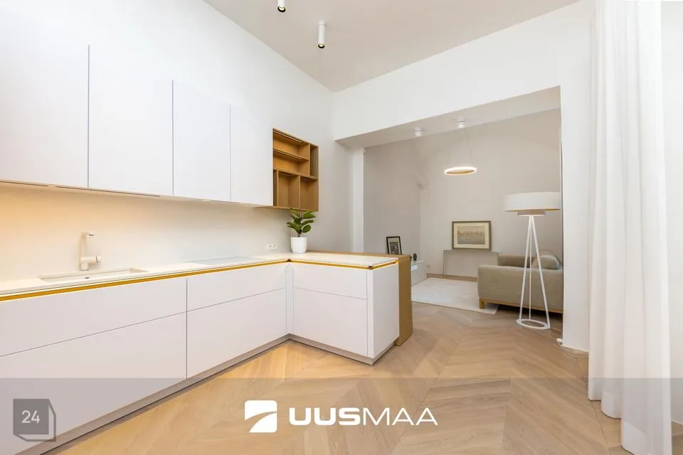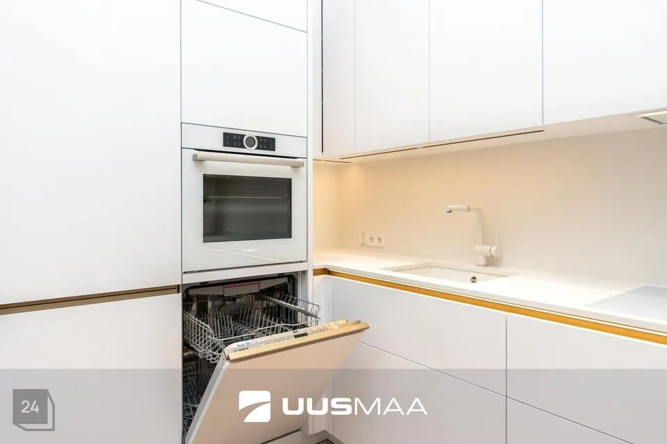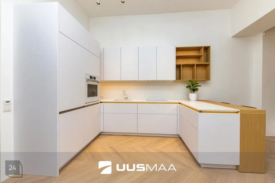 Põrandale on paigaldatud naturaalne õlitatud tamme puitparkett ja vannitubades loovad luksusliku miljöö heledat tooni marmorplaadid. Köök on varustatud funktisonaalse ja elegantse LEICHT köögimööbliga, köögitehnika BOSCH. Kogu valgustuse juhtimine on dünaamiline e. dimmerdatav (DALI).