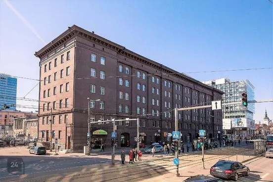 На продажу поступает действительно просторная 4-комнатная квартира в историческом здании в центре Таллинна, построенном в 1936 году по проекту архитектора Роберта Натуса. Скульптуры на фасаде являются работой О. Гольдберга. В здании есть лифт. Планировка квартиры позволяет