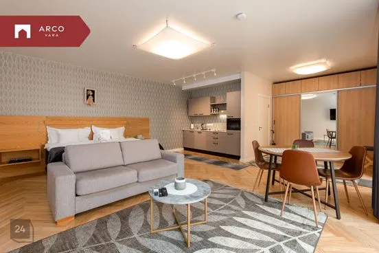 Üürile anda avar ja kaunis stuudiokorter avatud planeeringuga, mis on kohe vaba - 15.05.26. MAGAMISNURK - Korteris on hubane magamisnurk, kus on suur voodi. KÖÖK - Korteris on hästi varustatud köök, kus kõik vajalik on olemas - külmik, pliit, ahi ja nõudepesumasin.