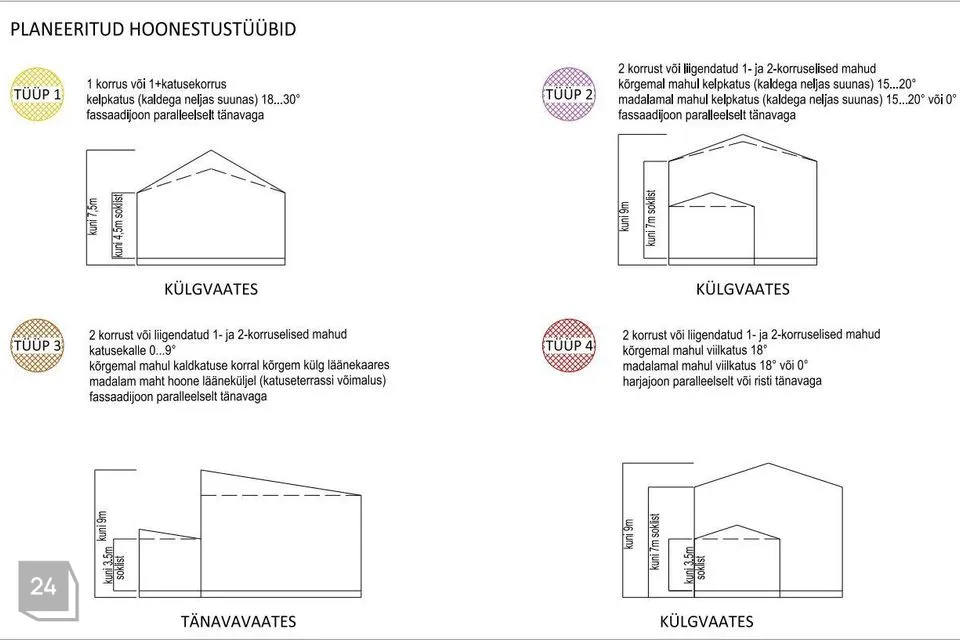Planeeringualale on planeeritud nelja tüüpi hoonestus. Kõikidel hoonetel on lubatud keldrikorrus.