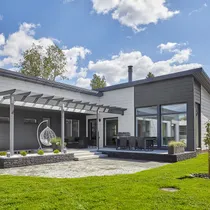 Kastelli erilahendus ( 153 m2 netopinda, 195 m2 brutopinda + varjualune 46 m2 + katusealused terrassid) tehasepakett koos avatäidetega (uksed ja aknad), ilma vundamendi, fassaadi ja katusematerjalita al. 119 900 EUR koos transpordi ja montaaziga Harjumaal. Maja võimalik tellida erinevate katuselahendustega ja ehitusetappidena - tehasepaketina, kinnine karp (väljast valmis) või võtmed kätte. Sarnase maja valmimist saab näha https://kastelli.ee/kastelli-plazia-maja-nurgakivi-saates/