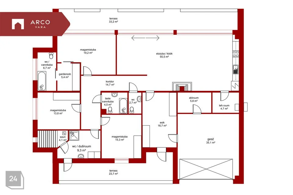 Planeeritud on ühekordne 213,1 m² suurune eramu, mille koosseisu kuuluvad esik, abiruum, tehnoruum, avatud köögiga elutuba, koridor, tualett, vannituba, 3 magamistuba, duširuum/ tualett, garderoob, vannituba/ tualett. Lisaks 35,1 m² garaaž kahele autole ja kaks avarat terrassi, ligikaudu 23 m² ja 33 m².