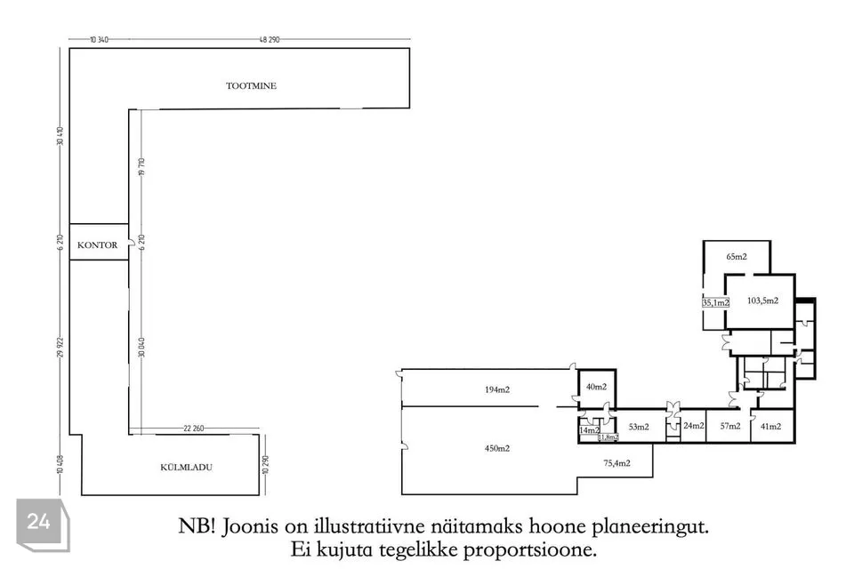 3) Büroohoone 80 m2, esik, kolm bürooruumi, sanitaarruum. Küttealikaks õhksoojuspump.