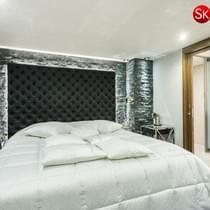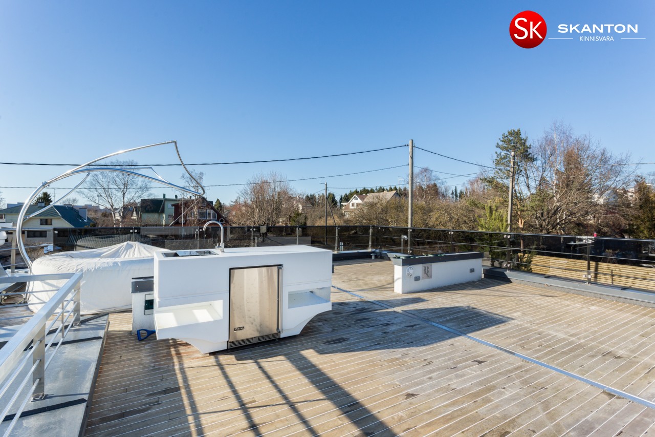 The third floor has a large bedroom, complete with a bathroom with a whirlpool hot tub, toilet and a walk-in wardrobe. The bedroom and bathroom have access to the terrace. There is also a spacious living room with a fireplace, a kitchen and a dining room with access to the grand rooftop terrace. The 130 m2 terrace has a high-quality open-air kitchen incorporating a grill and a whirlpool hot tub to enjoy summer nights and most wonderful sunsets.