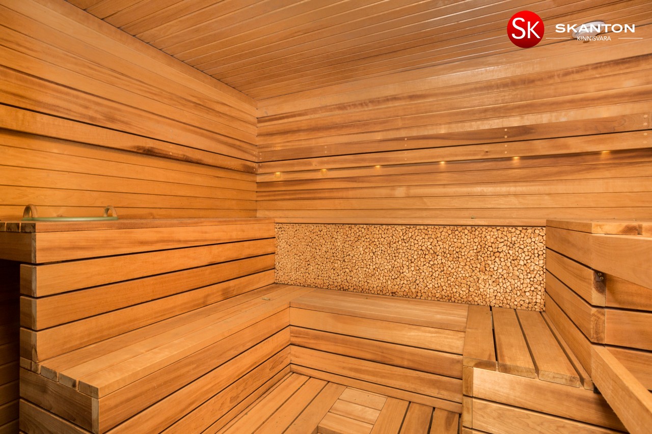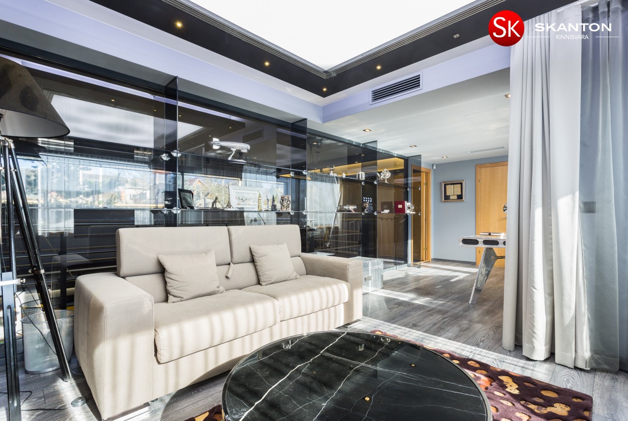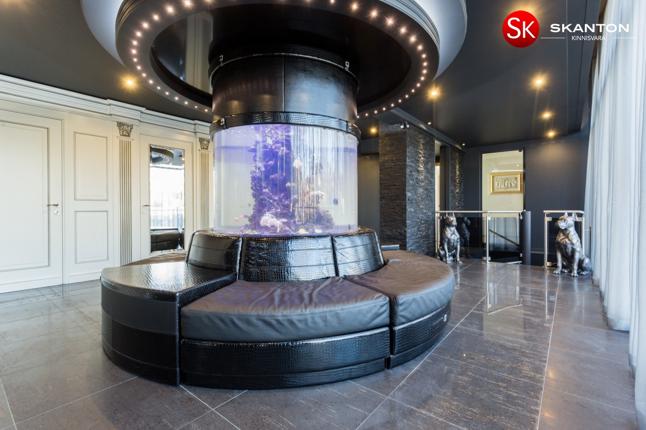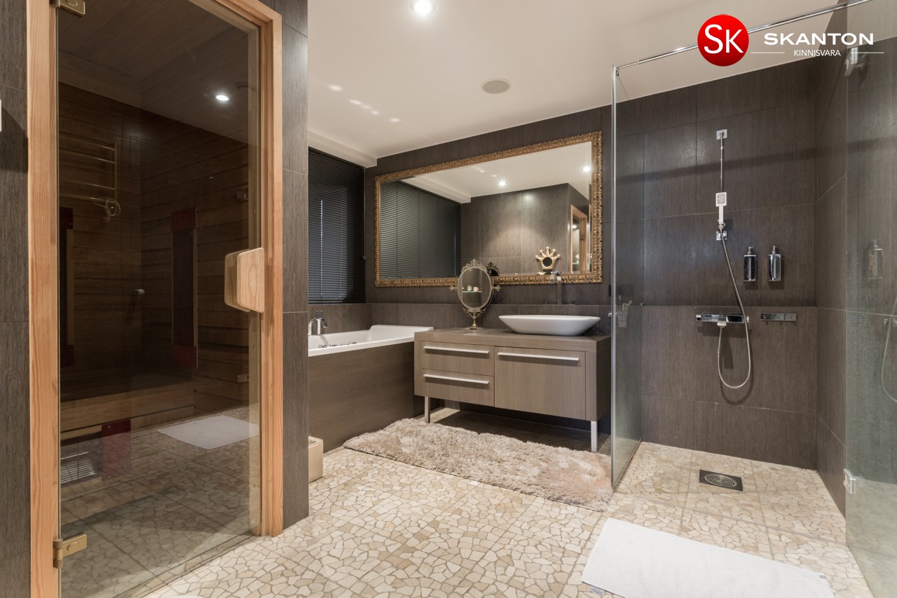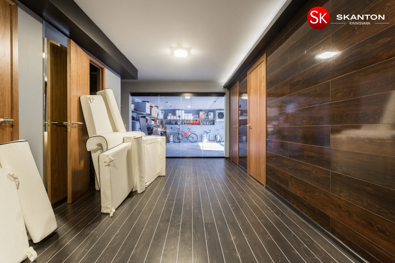 The second floor holds a spacious lobby with wardrobes and a round sea aquarium; a laundry room; two bedrooms; a bathroom-toilet with a bath; a third bedroom with a front room, walk-in wardrobe, infrared sauna with a bathroom-toiler and a glazed balcony. A roomy and a bit secluded study with a bathroom-toilet is also located on the second floor.