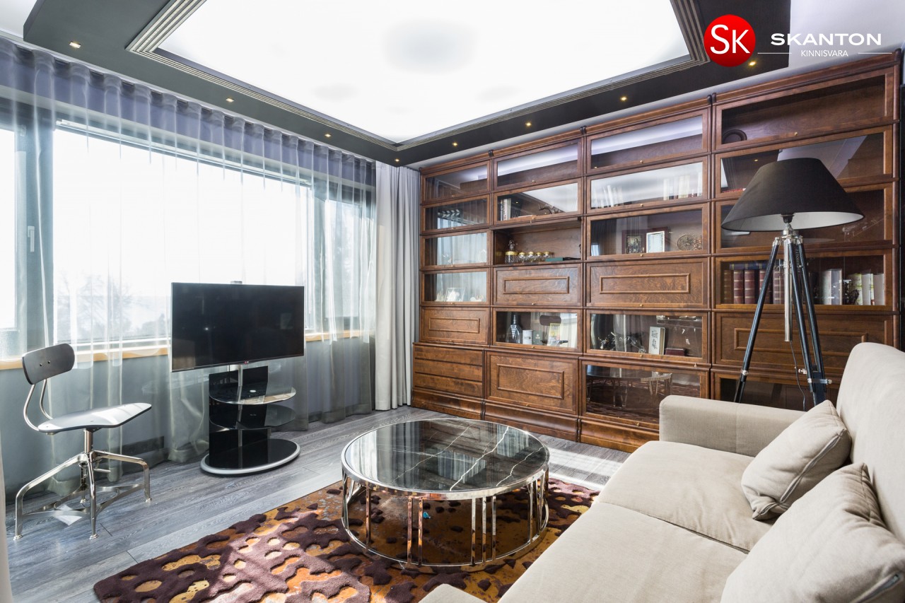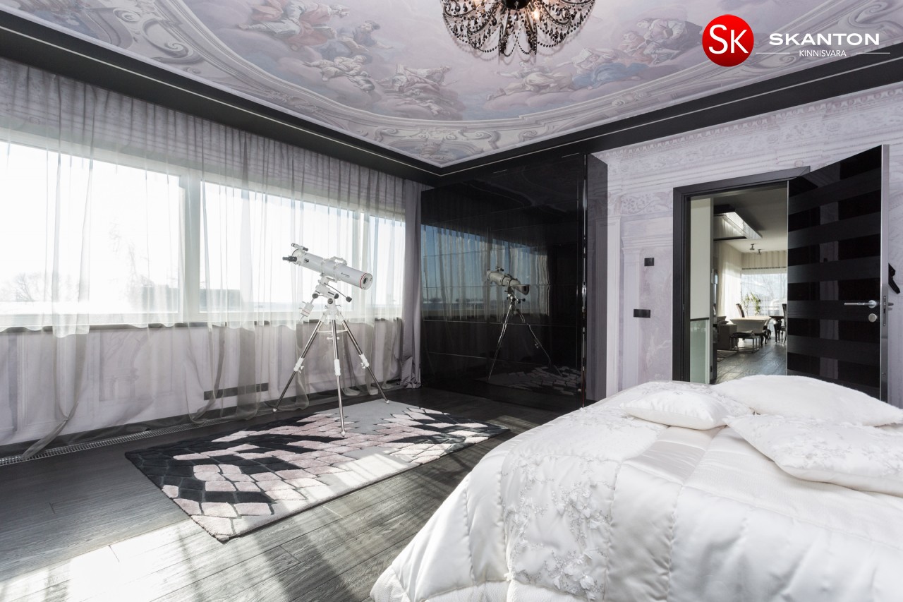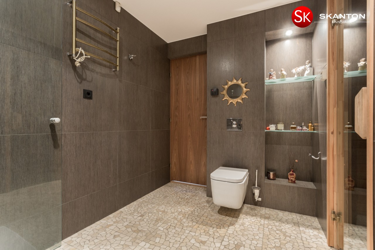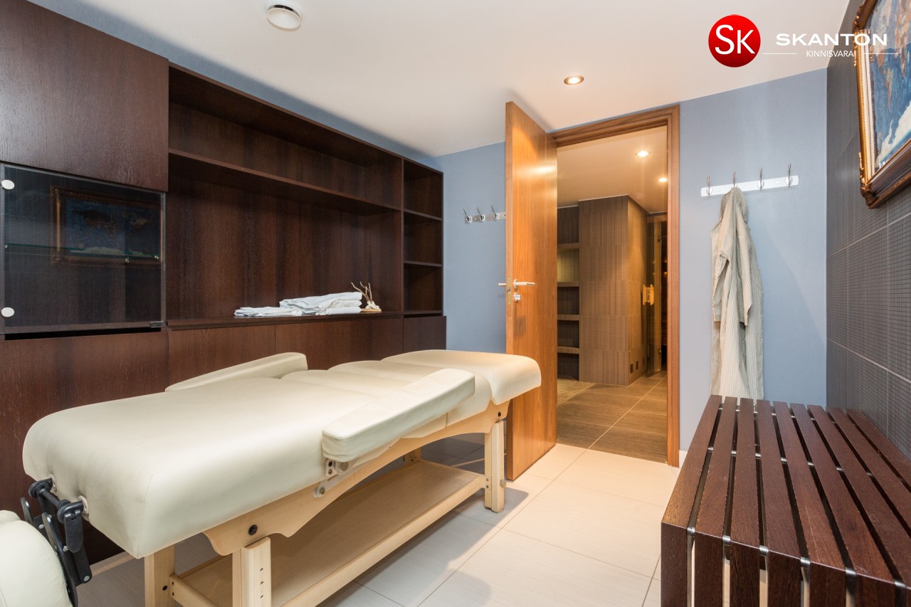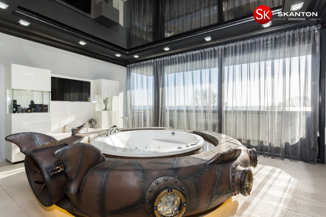The second floor holds a spacious lobby with wardrobes and a round sea aquarium; a laundry room; two bedrooms; a bathroom-toilet with a bath; a third bedroom with a front room, walk-in wardrobe, infrared sauna with a bathroom-toiler and a glazed balcony. A roomy and a bit secluded study with a bathroom-toilet is also located on the second floor.