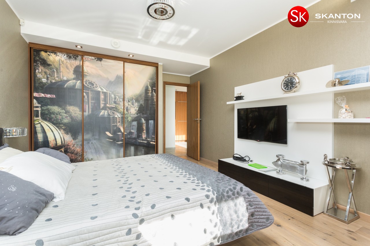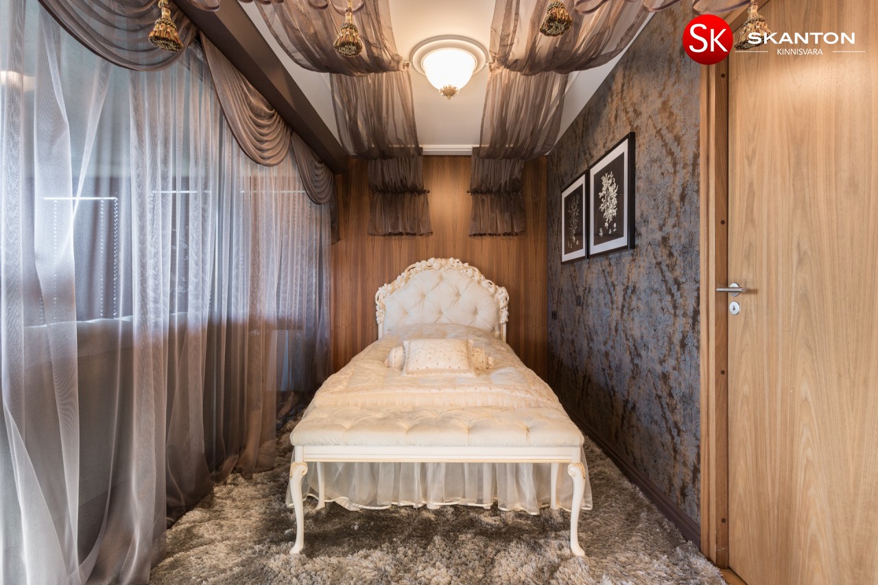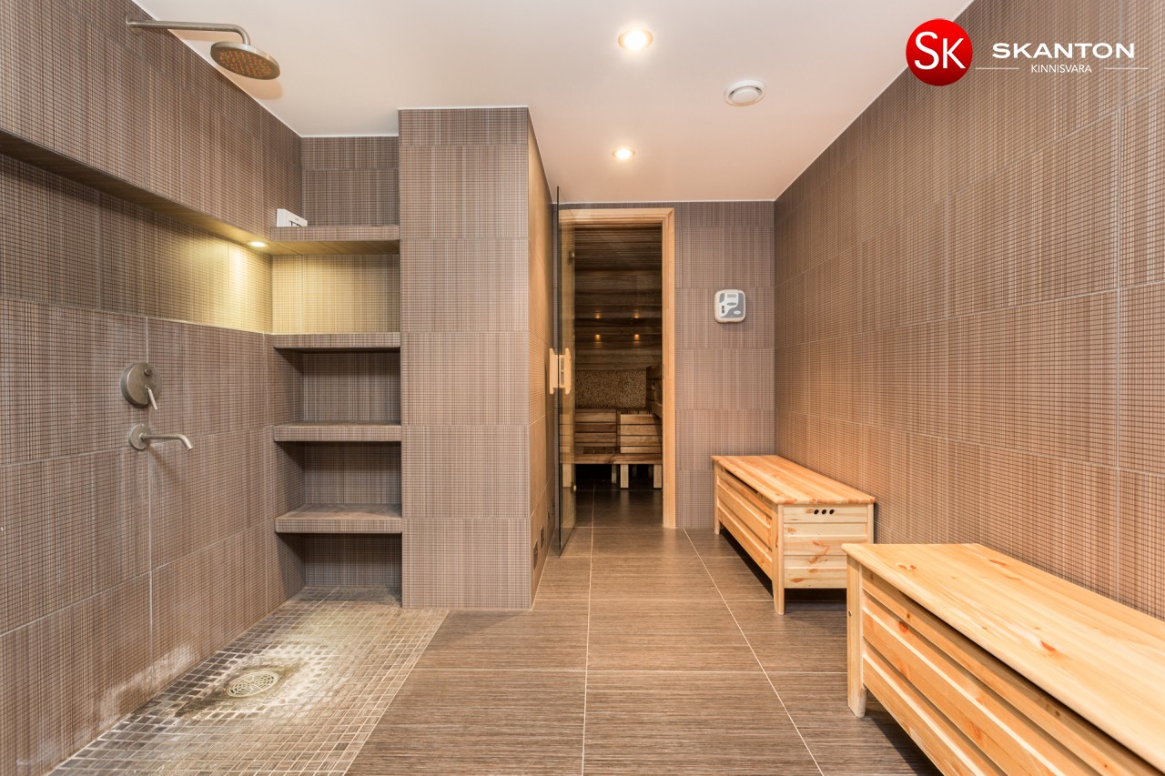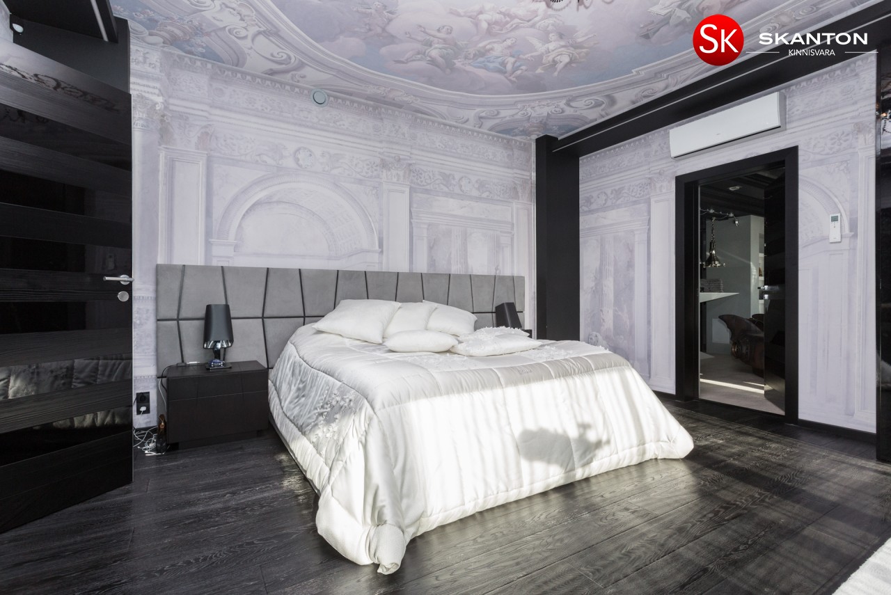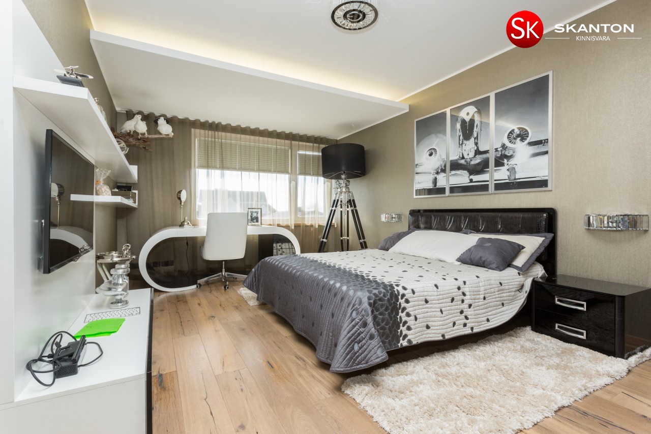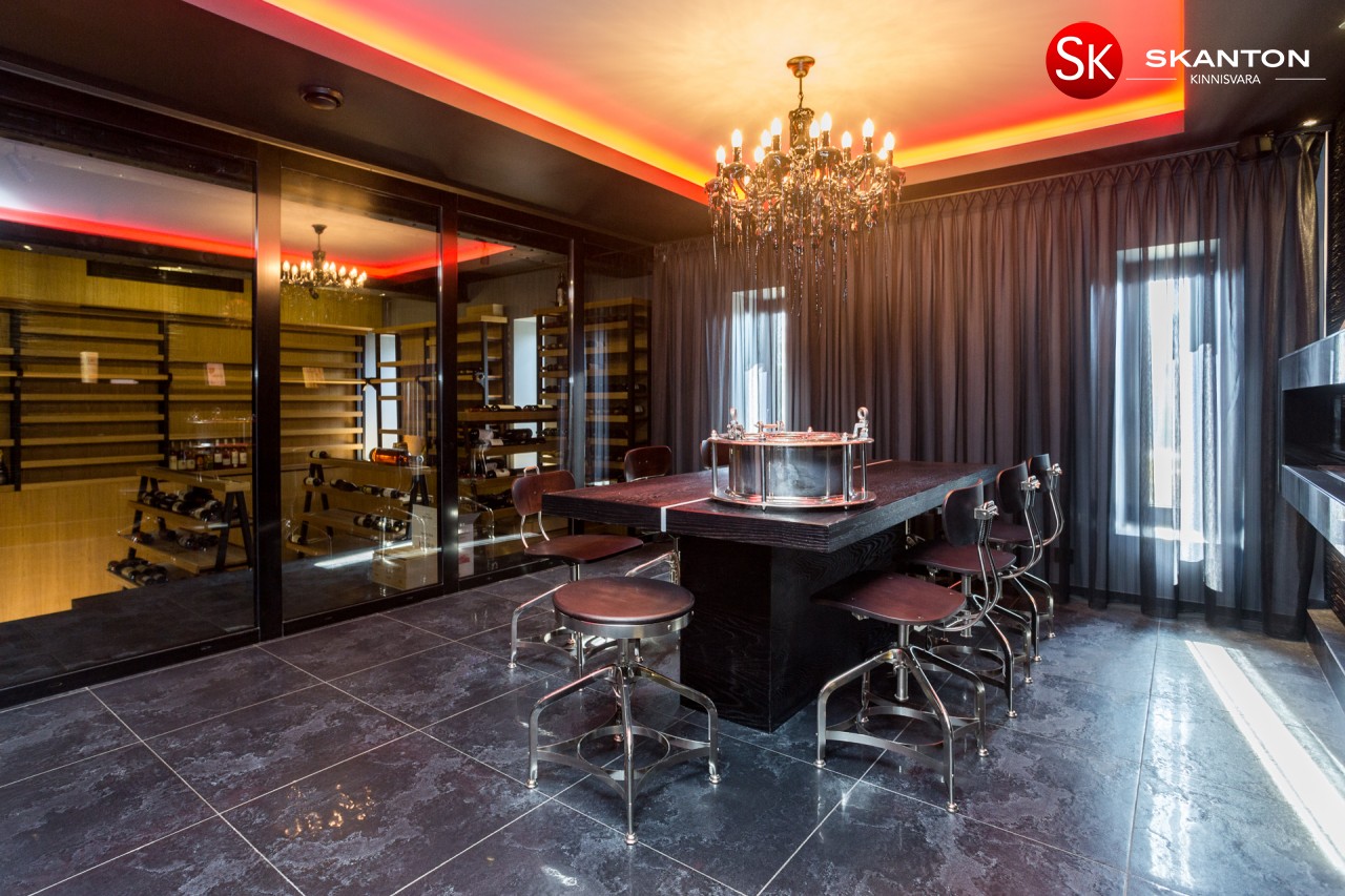 The second floor holds a spacious lobby with wardrobes and a round sea aquarium; a laundry room; two bedrooms; a bathroom-toilet with a bath; a third bedroom with a front room, walk-in wardrobe, infrared sauna with a bathroom-toiler and a glazed balcony. A roomy and a bit secluded study with a bathroom-toilet is also located on the second floor.